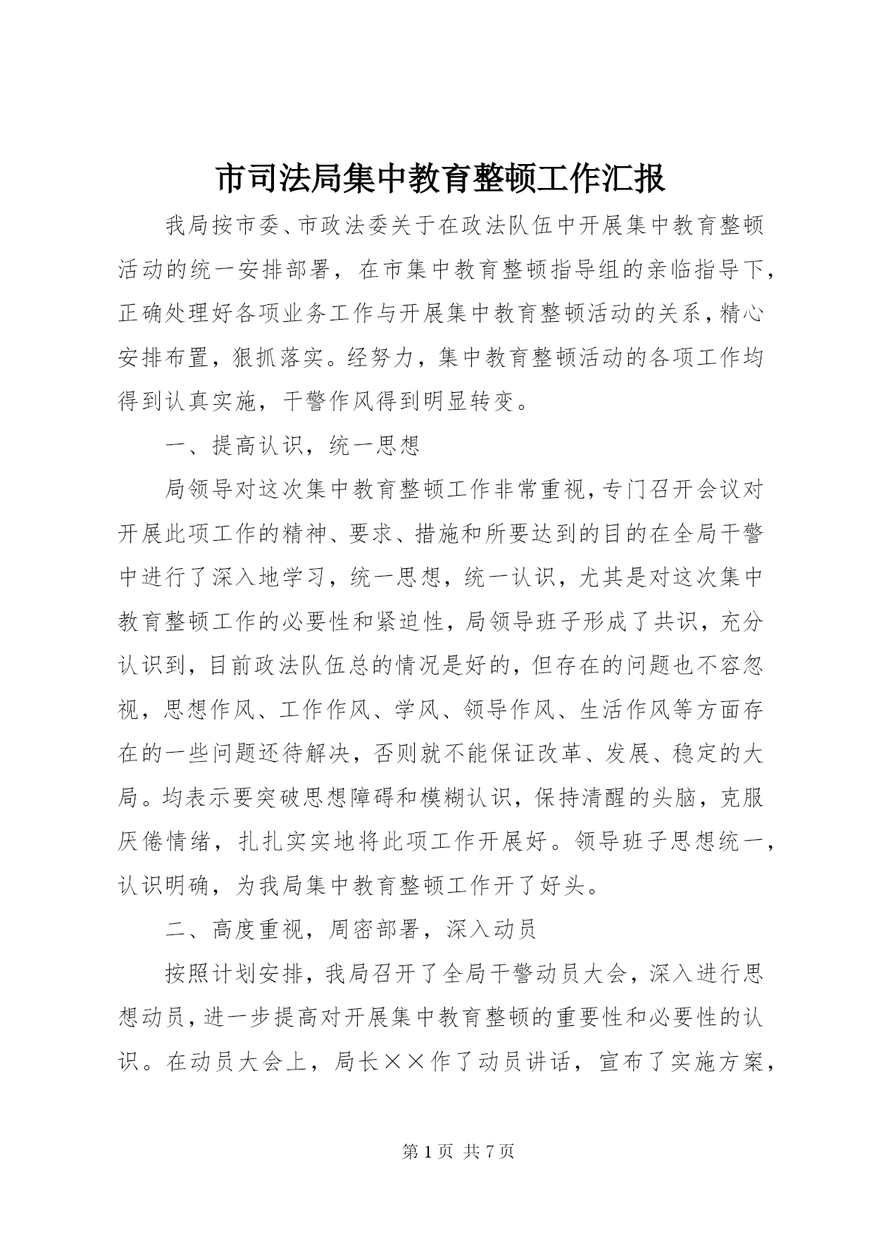第PAGE\*Arabic\*MERGEFORMAT7页共NUMPAGES\*MERGEFORMAT7页市司法局集中教育整顿工作汇报我局按市委、市政法委关于在政法队伍中开展集中教育整顿活动的统一安排部署,在市集中教育整顿指导组的亲临指导下,正确处理好各项业务工作与开展集中教育整顿活动的关系,精心安排布置,狠抓落实。经努力,集中教育整顿活动的各项工作均得到认真实施,干警作风得到明显转变。一、提高认识,统一思想局领导对这次集中教育整顿工作非常重视,专门召开会议对开展此项工作的精神、要求、措施和所要