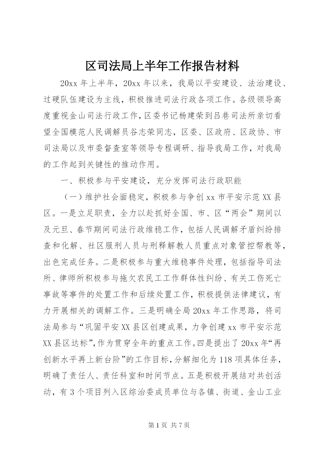 第PAGE\*Arabic\*MERGEFORMAT7页共NUMPAGES\*MERGEFORMAT7页区司法局上半年工作报告材料20xx年上半年,20xx年以来,我局以平安建设、法治建设、过硬队伍建设为主线,积极推进司法行政各项工作。各级领导高度重视金山司法行政工作,区委书记杨建荣到吕巷司法所亲切看望全国模范人民调解员谷志荣同志,区委、区政府、区政协、市司法局以及市委督查室等领导专程调研、指导我局工作,对我局的工作起到关键性的推动作用。一、积极参与平安建设,充分发挥司法行政职能(一)维护社会