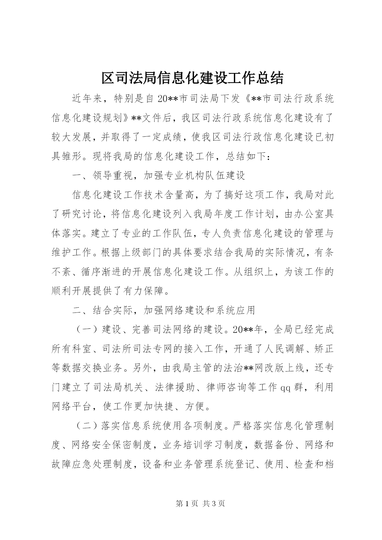 第PAGE\*Arabic\*MERGEFORMAT3页共NUMPAGES\*MERGEFORMAT3页区司法局信息化建设工作总结近年来,特别是自20**市司法局下发《**市司法行政系统信息化建设规划》**文件后,我区司法行政系统信息化建设有了较大发展,并取得了一定成绩,使我区司法行政信息化建设已初具雏形。现将我局的信息化建设工作,总结如下:一、领导重视,加强专业机构队伍建设信息化建设工作技术含量高,为了搞好这项工作,我局对此了研究讨论,将信息化建设列入我局年度工作计划,由办公室具体落实。建立