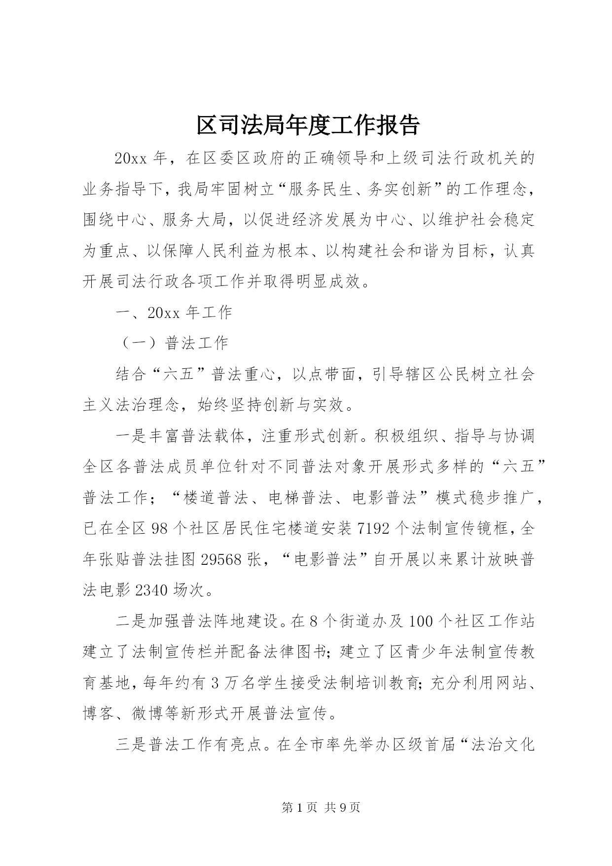 第PAGE\*Arabic\*MERGEFORMAT9页共NUMPAGES\*MERGEFORMAT9页区司法局年度工作报告20xx年,在区委区政府的正确领导和上级司法行政机关的业务指导下,我局牢固树立“服务民生、务实创新”的工作理念,围绕中心、服务大局,以促进经济发展为中心、以维护社会稳定为重点、以保障人民利益为根本、以构建社会和谐为目标,认真开展司法行政各项工作并取得明显成效。一、20xx年工作(一)普法工作结合“六五”普法重心,以点带面,引导辖区公民树立社会主义法治理念,始终坚持创新与实