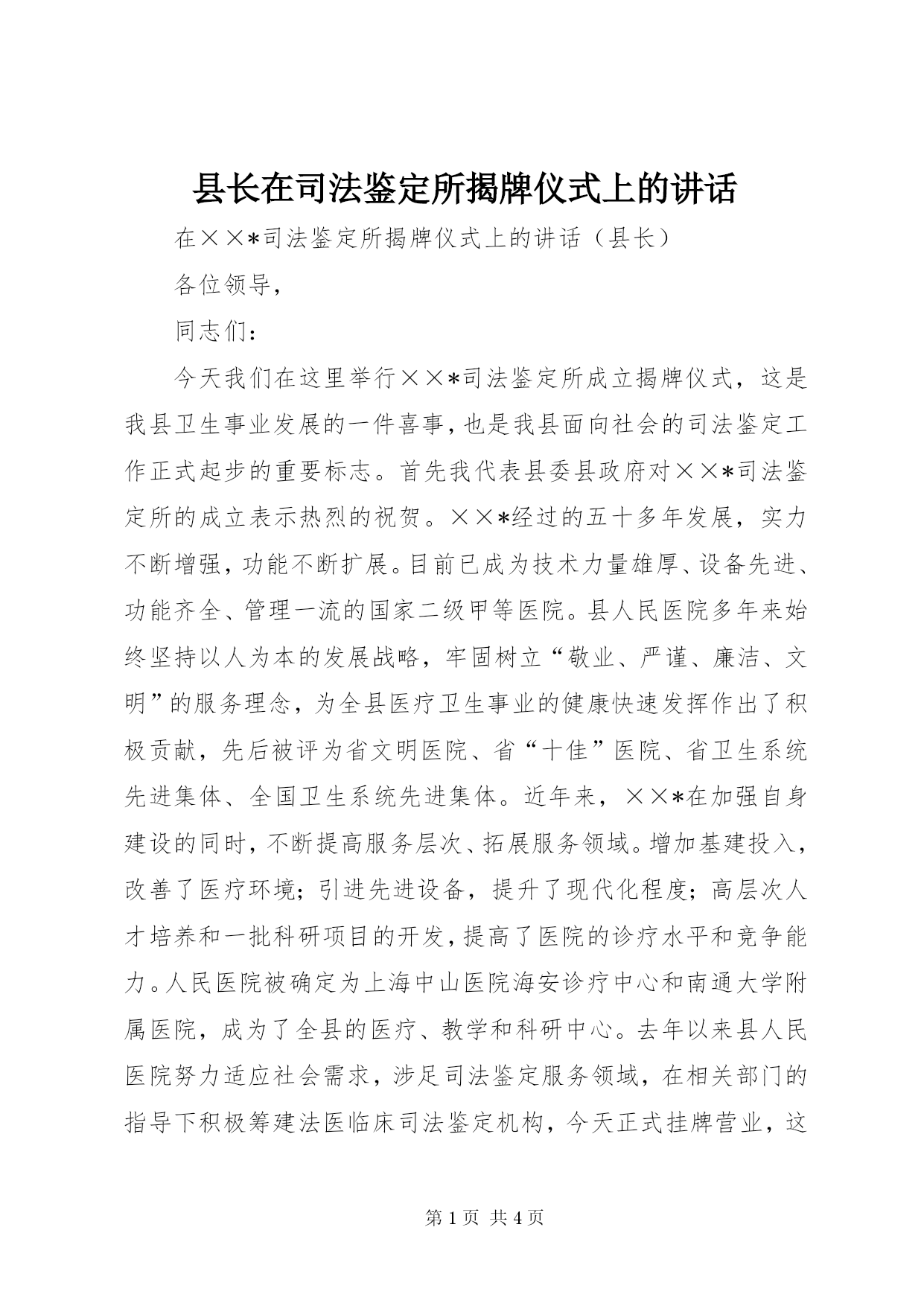 第PAGE\*Arabic\*MERGEFORMAT4页共NUMPAGES\*MERGEFORMAT4页县长在司法鉴定所揭牌仪式上的讲话在××*司法鉴定所揭牌仪式上的讲话(县长)各位领导,同志们:今天我们在这里举行××*司法鉴定所成立揭牌仪式,这是我县卫生事业发展的一件喜事,也是我县面向社会的司法鉴定工作正式起步的重要标志。首先我代表县委县政府对××*司法鉴定所的成立表示热烈的祝贺。××*经过的五十多年发展,实力不断增强,功能不断扩展。目前已成为技术力量雄厚、设备先进、功能齐全、管理一流的国家
