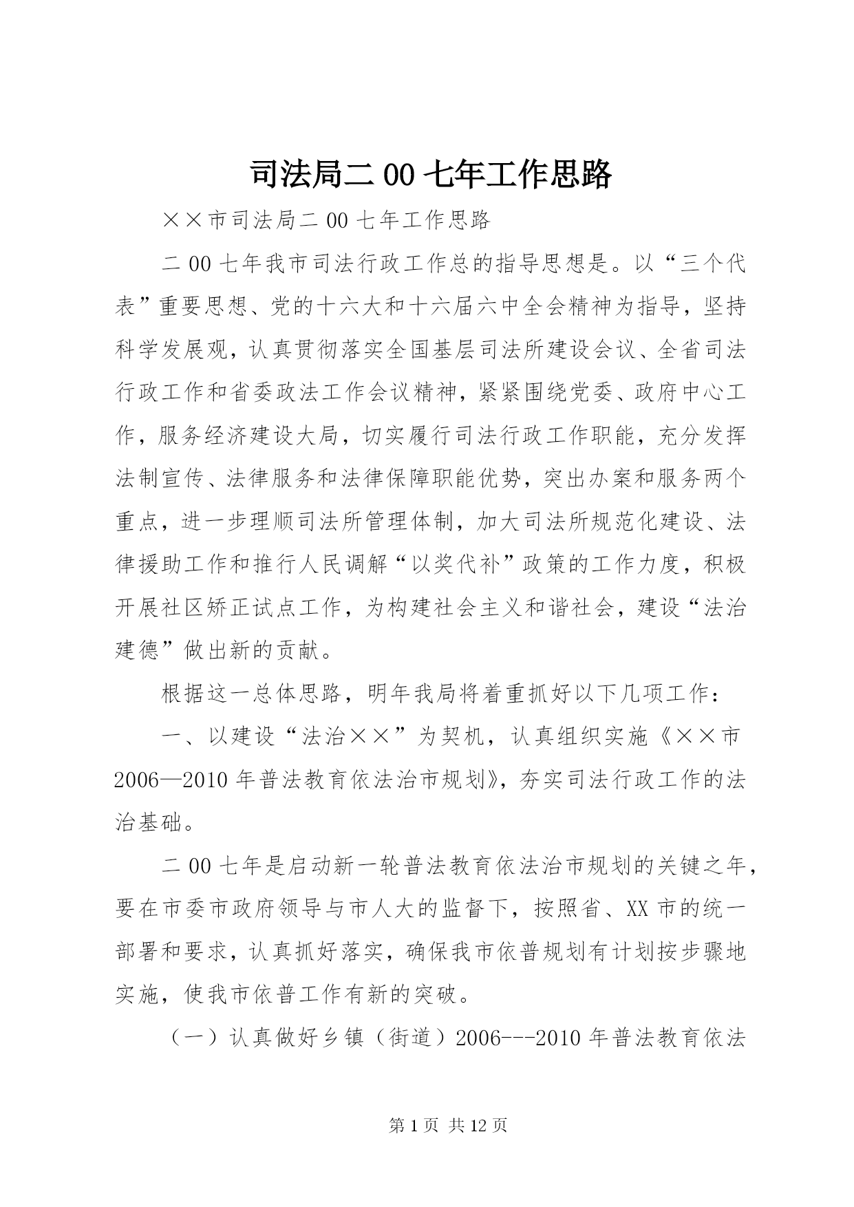第PAGE\*Arabic\*MERGEFORMAT12页共NUMPAGES\*MERGEFORMAT12页司法局二00七年工作思路××市司法局二00七年工作思路二00七年我市司法行政工作总的指导思想是。以“三个代表”重要思想、党的十六大和十六届六中全会精神为指导,坚持科学发展观,认真贯彻落实全国基层司法所建设会议、全省司法行政工作和省委政法工作会议精神,紧紧围绕党委、政府中心工作,服务经济建设大局,切实履行司法行政工作职能,充分发挥法制宣传、法律服务和法律保障职能优势,突出办案和服务两个重点