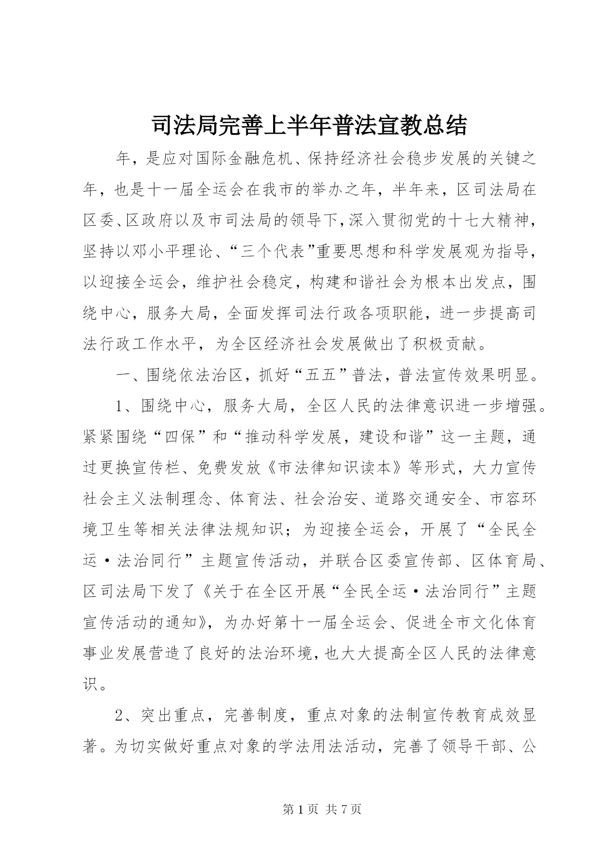 第PAGE\*Arabic\*MERGEFORMAT7页共NUMPAGES\*MERGEFORMAT7页司法局完善上半年普法宣教总结年,是应对国际金融危机、保持经济社会稳步发展的关键之年,也是十一届全运会在我市的举办之年,半年来,区司法局在区委、区政府以及市司法局的领导下,深入贯彻党的十七大精神,坚持以邓小平理论、“三个代表”重要思想和科学发展观为指导,以迎接全运会,维护社会稳定,构建和谐社会为根本出发点,围绕中心,服务大局,全面发挥司法行政各项职能,进一步提高司法行政工作水平,为全区经济社会