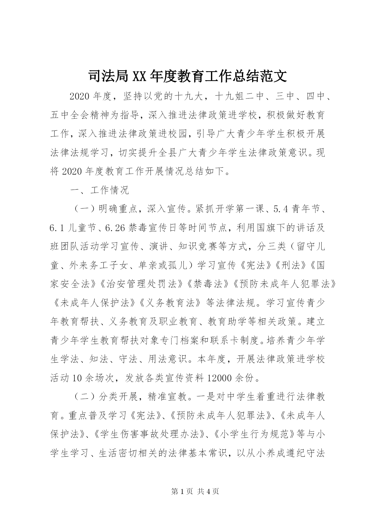 第PAGE\*Arabic\*MERGEFORMAT4页共NUMPAGES\*MERGEFORMAT4页司法局XX年度教育工作总结范文2020年度,坚持以党的十九大,十九姐二中、三中、四中、五中全会精神为指导,深入推进法律政策进学校,积极做好教育工作,深入推进法律政策进校园,引导广大青少年学生积极开展法律法规学习,切实提升全县广大青少年学生法律政策意识。现将2020年度教育工作开展情况总结如下。一、工作情况(一)明确重点,深入宣传。紧抓开学第一课、5.4青年节、6.1儿童节、6.26禁毒宣传日