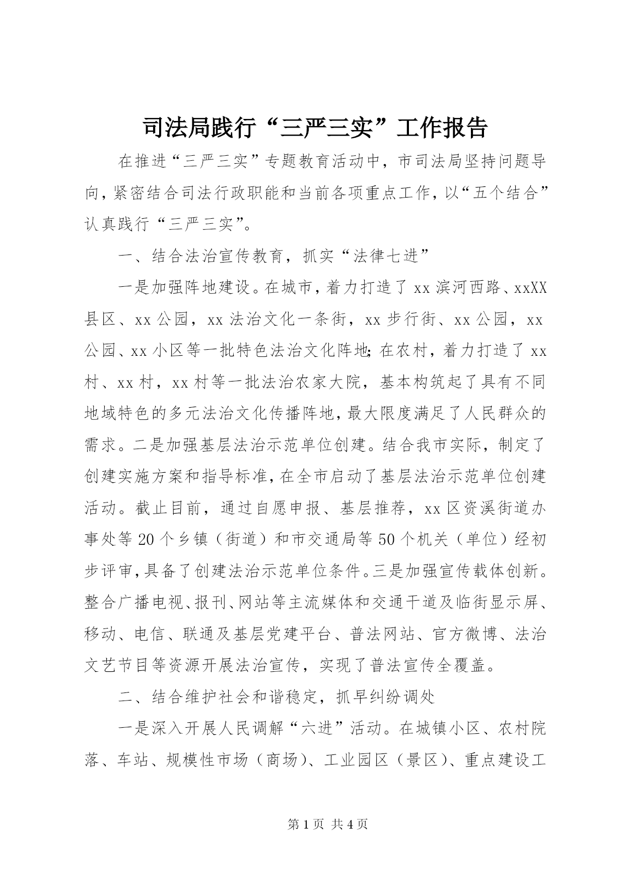 第PAGE\*Arabic\*MERGEFORMAT4页共NUMPAGES\*MERGEFORMAT4页司法局践行“三严三实”工作报告在推进“三严三实”专题教育活动中,市司法局坚持问题导向,紧密结合司法行政职能和当前各项重点工作,以“五个结合”认真践行“三严三实”。一、结合法治宣传教育,抓实“法律七进”一是加强阵地建设。在城市,着力打造了xx滨河西路、xxXX县区、xx公园,xx法治文化一条街,xx步行街、xx公园,xx公园、xx小区等一批特色法治文化阵地;在农村,着力打造了xx村、xx村,x