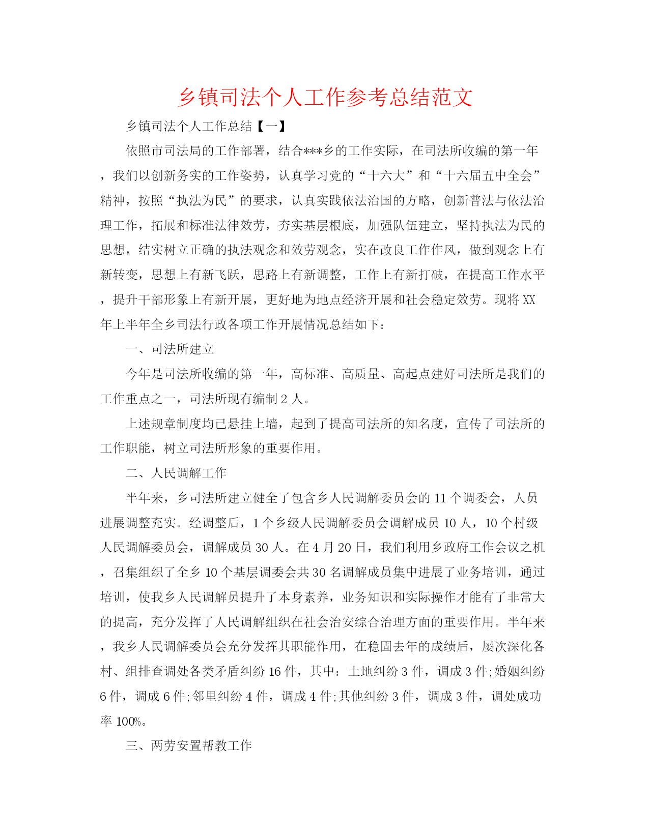 乡镇司法个人工作参考总结范文乡镇司法个人工作总结【一】依照市司法局的工作部署,结合***乡的工作实际,在司法所收编的第一年,我们以创新务实的工作姿势,认真学习党的“十六大”和“十六届五中全会”精神,按照“执法为民”的要求,认真实践依法治国的方略,创新普法与依法治理工作,拓展和标准法律效劳,夯实基层根底,加强队伍建立,坚持执法为民的思想,结实树立正确的执法观念和效劳观念,实在改良工作作风,做到观念上有新转变,思想上有新飞跃,思路上有新调整,工作上有新打破,在提高工作水平,提升干部形象上有新开展,更好地为地点