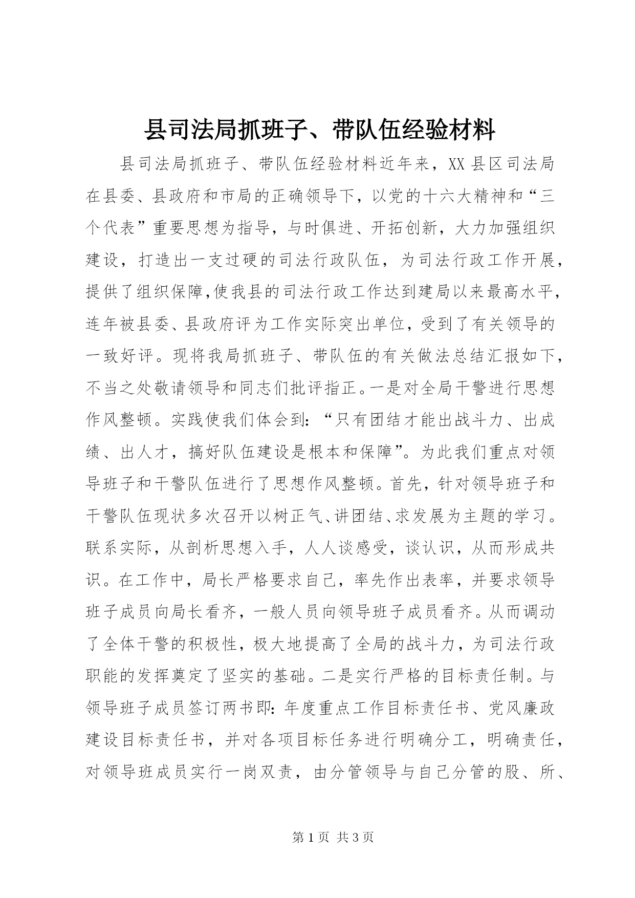 第PAGE\*Arabic\*MERGEFORMAT3页共NUMPAGES\*MERGEFORMAT3页县司法局抓班子、带队伍经验材料县司法局抓班子、带队伍经验材料近年来,XX县区司法局在县委、县政府和市局的正确领导下,以党的十六大精神和“三个代表”重要思想为指导,与时俱进、开拓创新,大力加强组织建设,打造出一支过硬的司法行政队伍,为司法行政工作开展,提供了组织保障,使我县的司法行政工作达到建局以来最高水平,连年被县委、县政府评为工作实际突出单位,受到了有关领导的一致好评。现将我局抓班子、带队