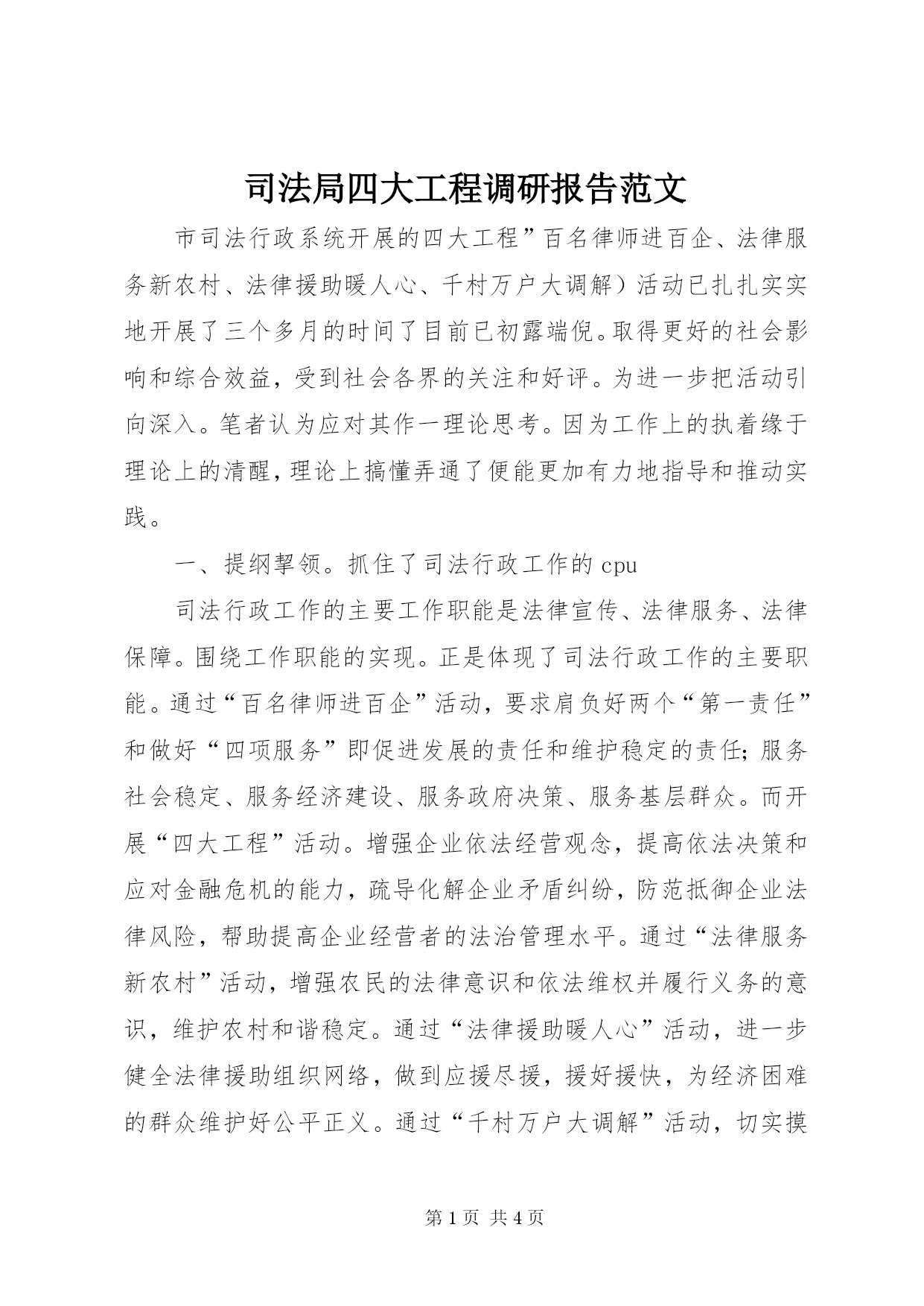 第PAGE\*Arabic\*MERGEFORMAT4页共NUMPAGES\*MERGEFORMAT4页司法局四大工程调研报告范文市司法行政系统开展的四大工程”百名律师进百企、法律服务新农村、法律援助暖人心、千村万户大调解)活动已扎扎实实地开展了三个多月的时间了目前已初露端倪。取得更好的社会影响和综合效益,受到社会各界的关注和好评。为进一步把活动引向深入。笔者认为应对其作一理论思考。因为工作上的执着缘于理论上的清醒,理论上搞懂弄通了便能更加有力地指导和推动实践。一、提纲挈领。抓住了司法行政工作