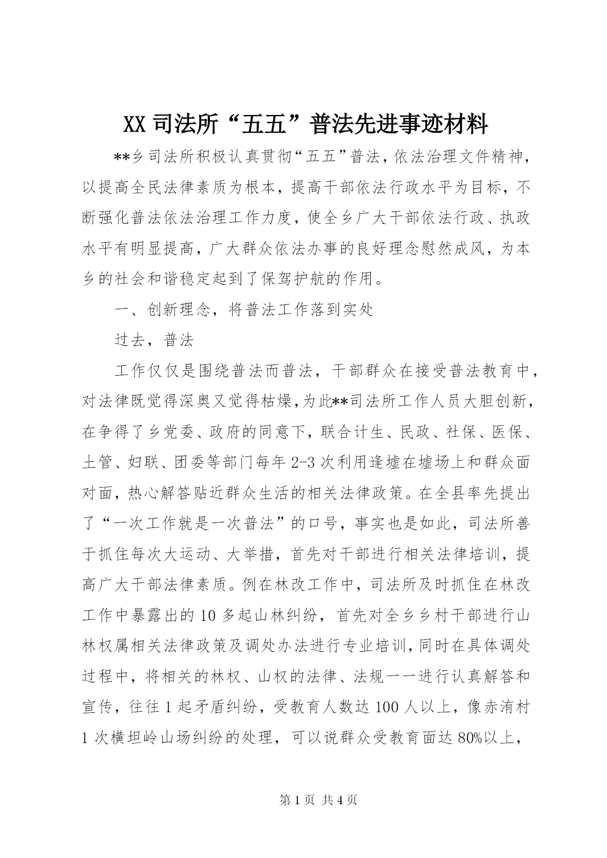 第PAGE\*Arabic\*MERGEFORMAT4页共NUMPAGES\*MERGEFORMAT4页XX司法所“五五”普法先进事迹材料**乡司法所积极认真贯彻“五五”普法,依法治理文件精神,以提高全民法律素质为根本,提高干部依法行政水平为目标,不断强化普法依法治理工作力度,使全乡广大干部依法行政、执政水平有明显提高,广大群众依法办事的良好理念慰然成风,为本乡的社会和谐稳定起到了保驾护航的作用。一、创新理念,将普法工作落到实处过去,普法工作仅仅是围绕普法而普法,干部群众在接受普法教育中,对法