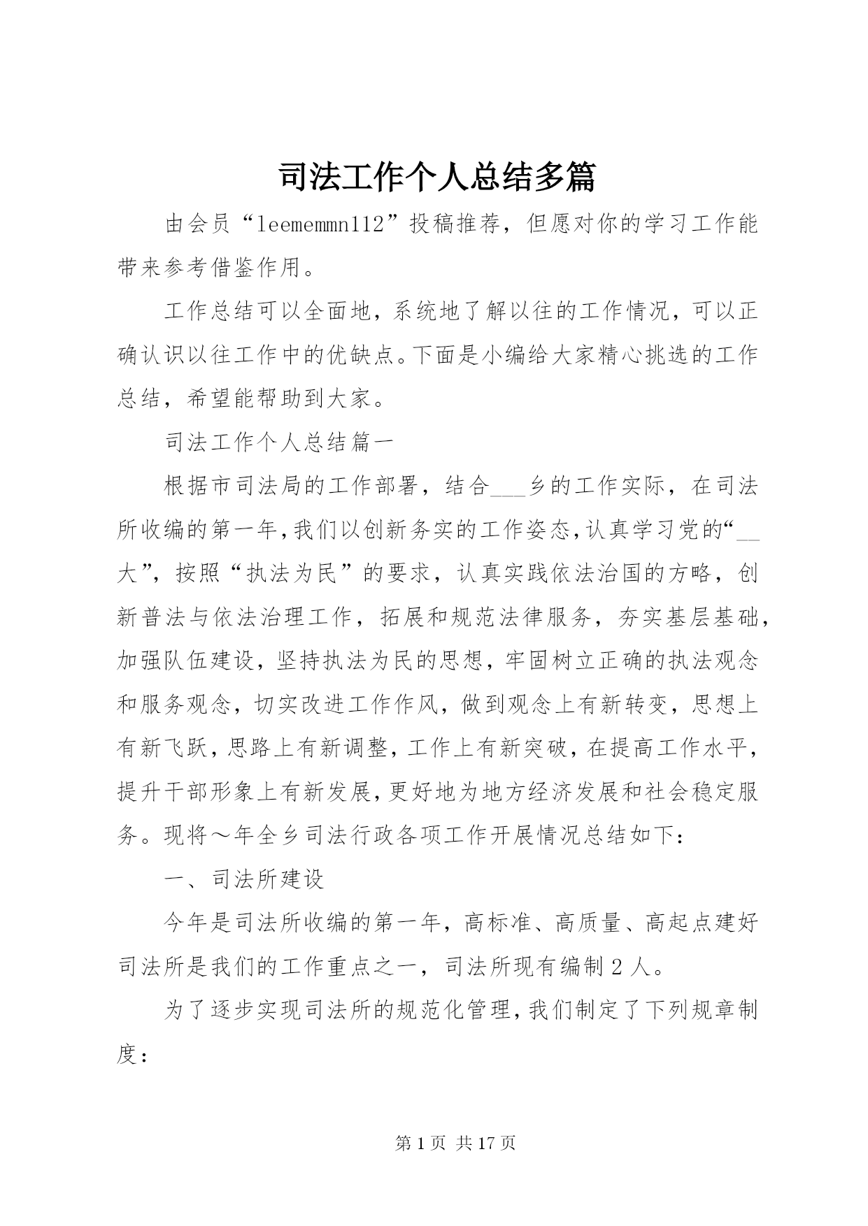 第PAGE\*Arabic\*MERGEFORMAT17页共NUMPAGES\*MERGEFORMAT17页司法工作个人总结多篇由会员“leememmn112”投稿推荐,但愿对你的学习工作能带来参考借鉴作用。工作总结可以全面地,系统地了解以往的工作情况,可以正确认识以往工作中的优缺点。下面是小编给大家精心挑选的工作总结,希望能帮助到大家。司法工作个人总结篇一根据市司法局的工作部署,结合___乡的工作实际,在司法所收编的第一年,我们以创新务实的工作姿态,认真学习党的“__大”,按照“执法为民”的