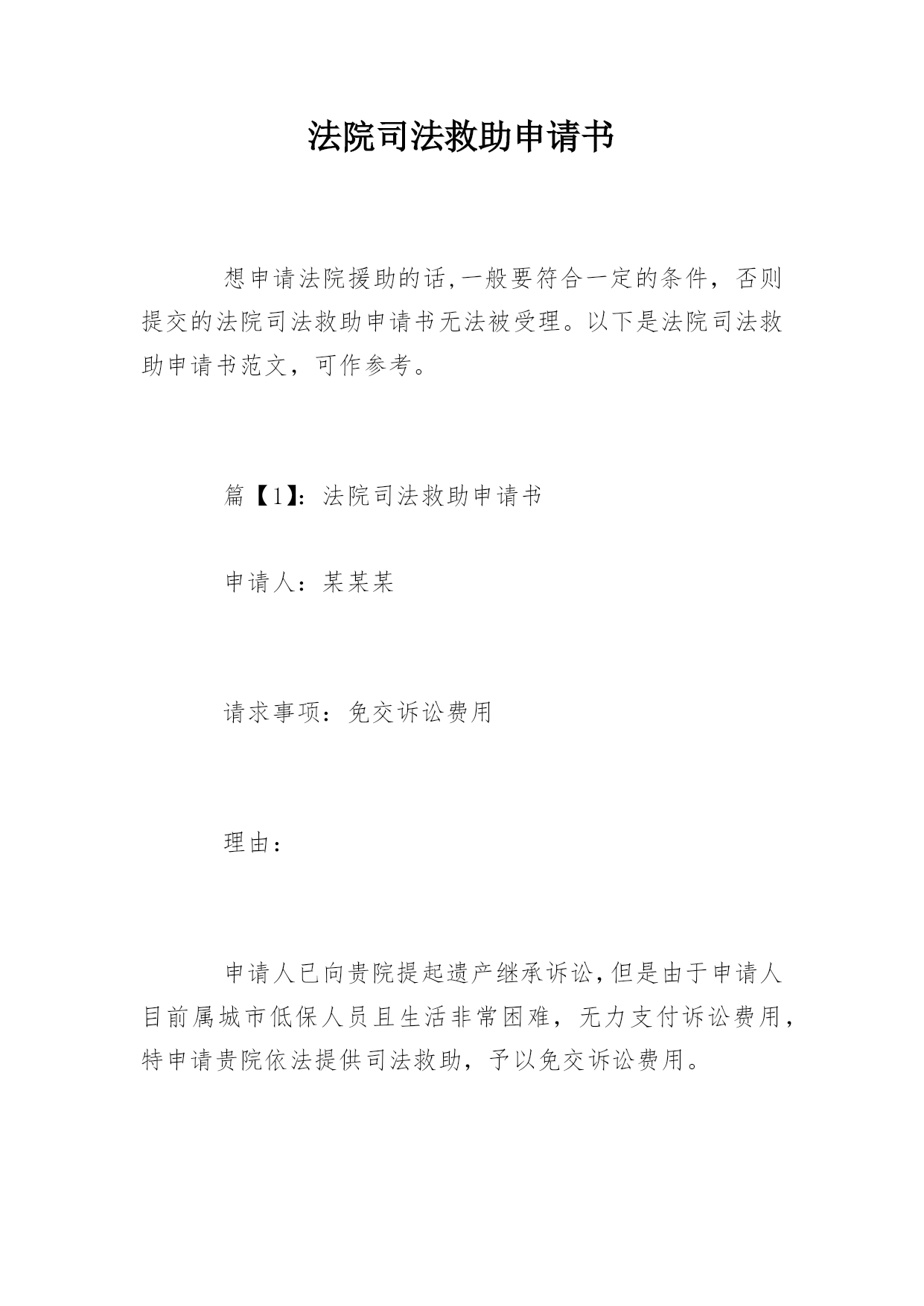 法院司法救助申请书想申请法院援助的话,一般要符合一定的条件,否则提交的法院司法救助申请书无法被受理。以下是法院司法救助申请书范文,可作参考。篇【1】:法院司法救助申请书申请人:某某某请求事项:免交诉讼费用理由:申请人已向贵院提起遗产继承诉讼,但是由于申请人目前属城市低保人员且生活非常困难,无力支付诉讼费用,特申请贵院依法提供司法救助,予以免交诉讼费用。请予准许为盼。此致某某区人民法院申请人:某某某20xx年x月x日附:街道低保及经济困难一份。篇【2】:法院司法救助申请书十三师党委政法委:自2005年以来,