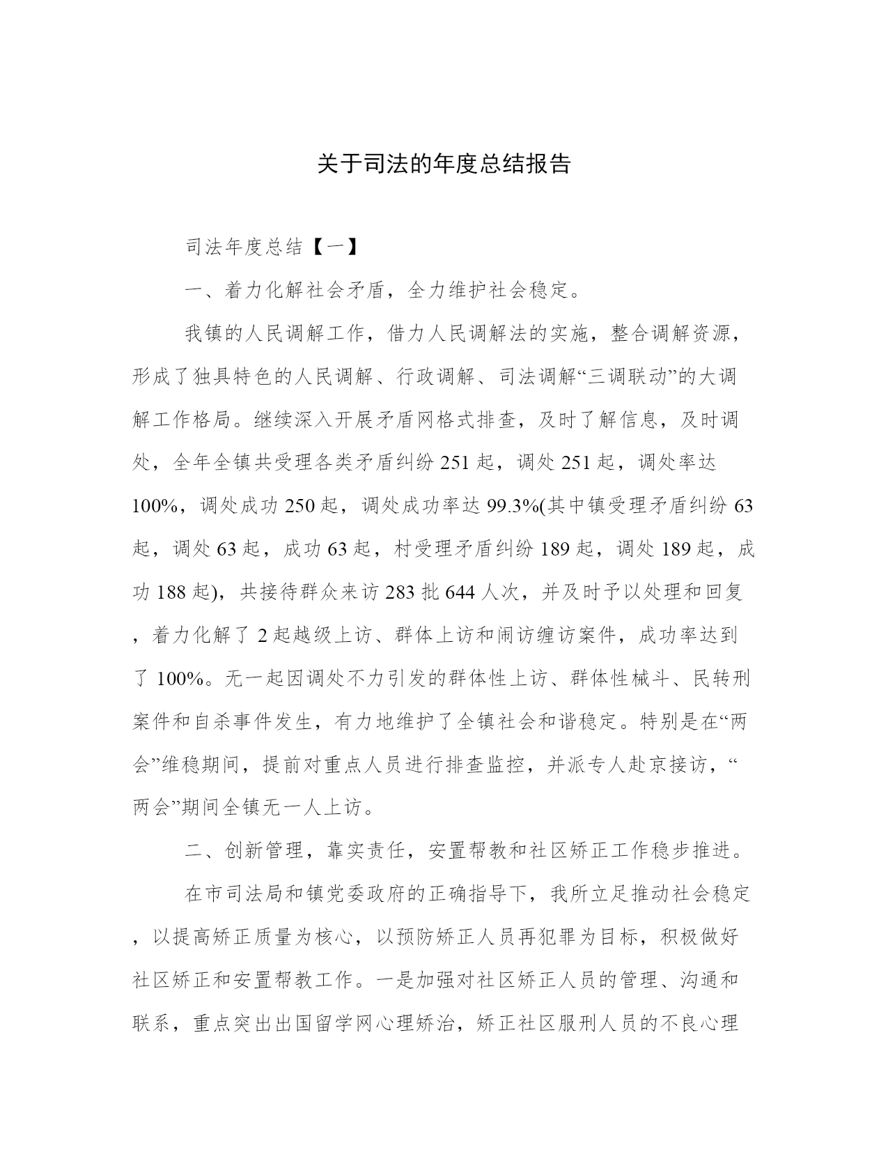 关于司法的年度总结报告司法年度总结【一】一、着力化解社会矛盾,全力维护社会稳定。我镇的人民调解工作,借力人民调解法的实施,整合调解资源,形成了独具特色的人民调解、行政调解、司法调解“三调联动”的大调解工作格局。继续深入开展矛盾网格式排查,及时了解信息,及时调处,全年全镇共受理各类矛盾纠纷251起,调处251起,调处率达100%,调处成功250起,调处成功率达99.3%(其中镇受理矛盾纠纷63起,调处63起,成功63起,村受理矛盾纠纷189起,调处189起,成功188起),共接待群众来访283批644人次,