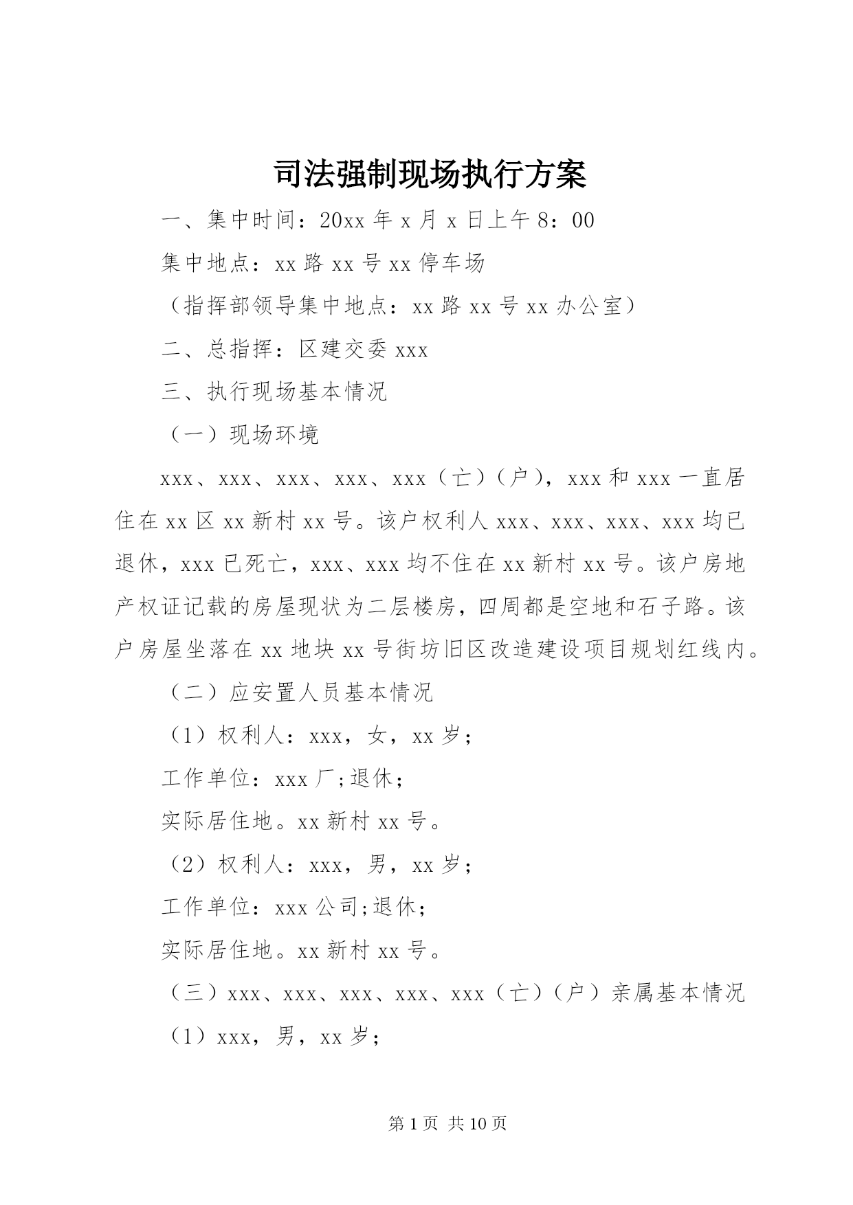 第PAGE\*Arabic\*MERGEFORMAT10页共NUMPAGES\*MERGEFORMAT10页司法强制现场执行方案一、集中时间:20xx年x月x日上午8:00集中地点:xx路xx号xx停车场(指挥部领导集中地点:xx路xx号xx办公室)二、总指挥:区建交委xxx三、执行现场基本情况(一)现场环境xxx、xxx、xxx、xxx、xxx(亡)(户),xxx和xxx一直居住在xx区xx新村xx号。该户权利人xxx、xxx、xxx、xxx均已退休,xxx已死亡,xxx、xxx均不住在xx