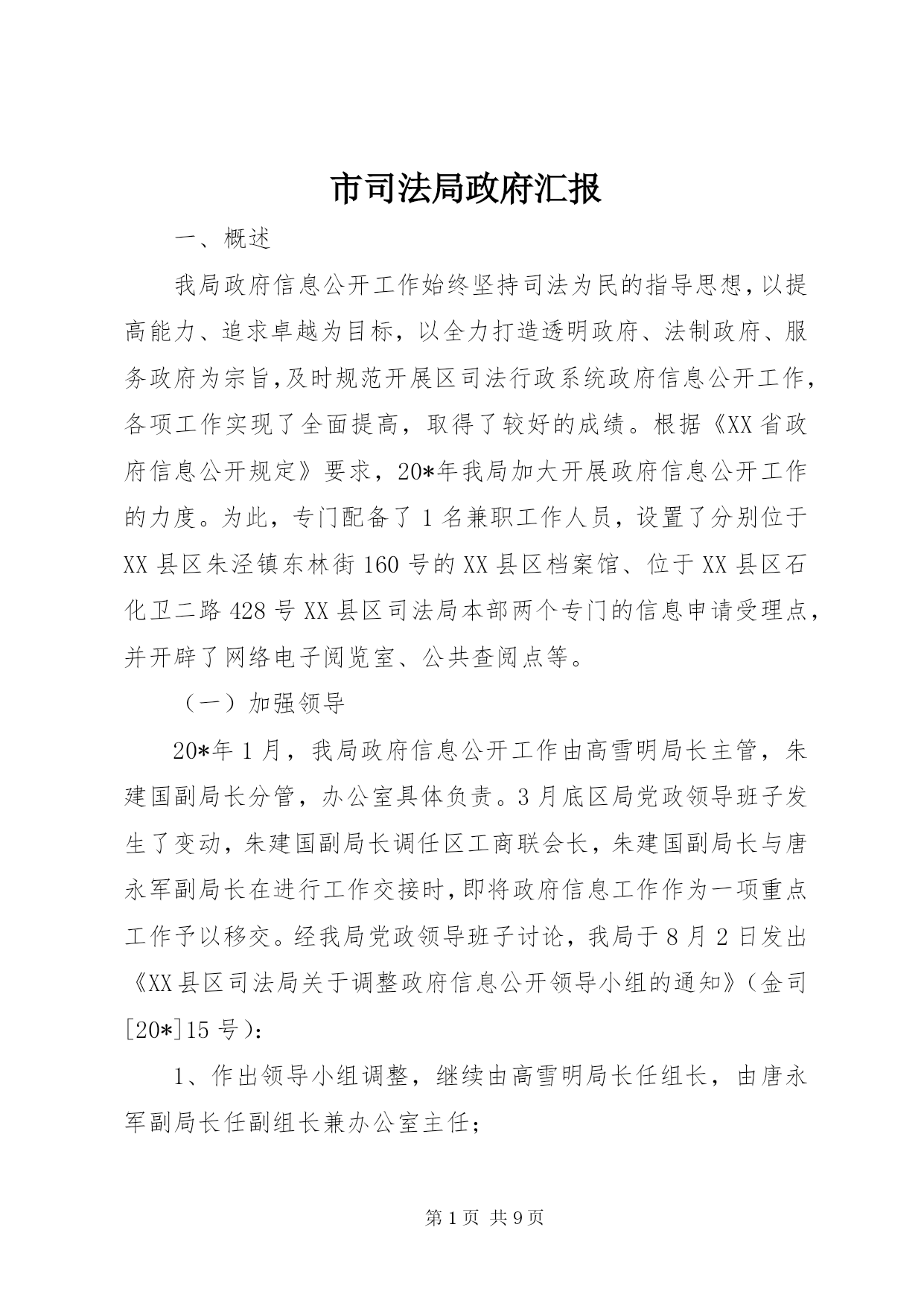 第PAGE\*Arabic\*MERGEFORMAT9页共NUMPAGES\*MERGEFORMAT9页市司法局政府汇报一、概述我局政府信息公开工作始终坚持司法为民的指导思想,以提高能力、追求卓越为目标,以全力打造透明政府、法制政府、服务政府为宗旨,及时规范开展区司法行政系统政府信息公开工作,各项工作实现了全面提高,取得了较好的成绩。根据《XX省政府信息公开规定》要求,20*年我局加大开展政府信息公开工作的力度。为此,专门配备了1名兼职工作人员,设置了分别位于XX县区朱泾镇东林街160号的XX
