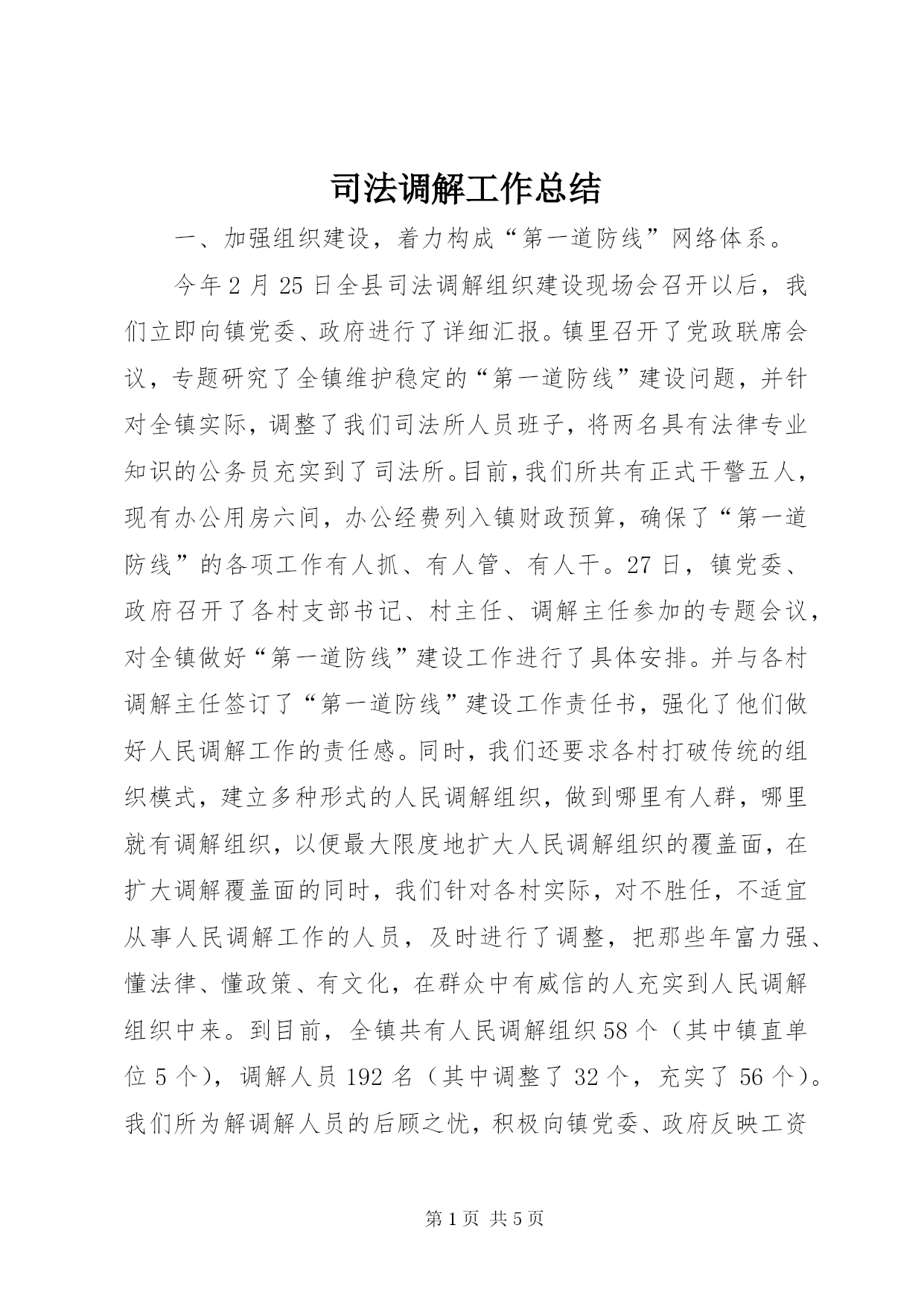 第PAGE\*Arabic\*MERGEFORMAT5页共NUMPAGES\*MERGEFORMAT5页司法调解工作总结一、加强组织建设,着力构成“第一道防线”网络体系。今年2月25日全县司法调解组织建设现场会召开以后,我们立即向镇党委、政府进行了详细汇报。镇里召开了党政联席会议,专题研究了全镇维护稳定的“第一道防线”建设问题,并针对全镇实际,调整了我们司法所人员班子,将两名具有法律专业知识的公务员充实到了司法所。目前,我们所共有正式干警五人,现有办公用房六间,办公经费列入镇财政预算,确保了“