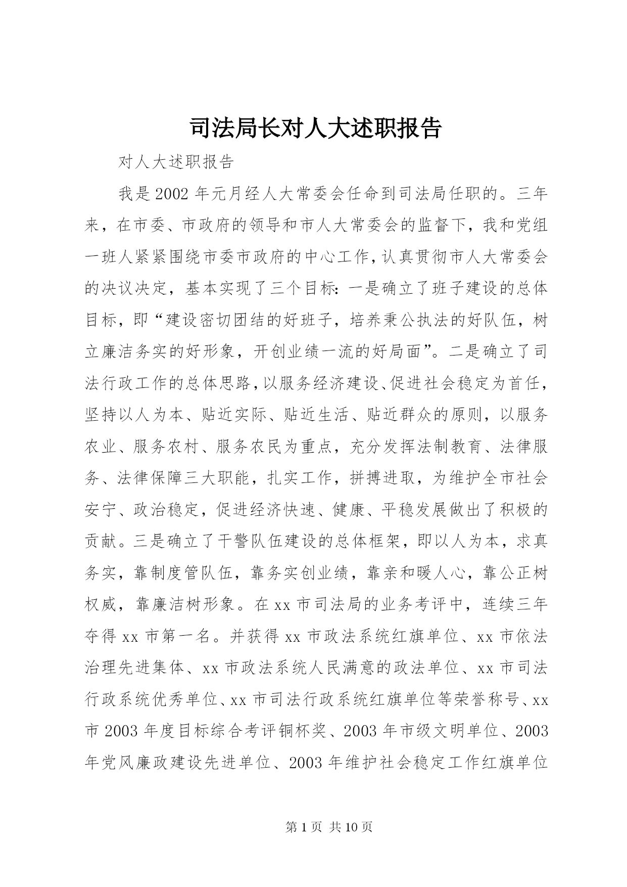 第PAGE\*Arabic\*MERGEFORMAT10页共NUMPAGES\*MERGEFORMAT10页司法局长对人大述职报告对人大述职报告我是2002年元月经人大常委会任命到司法局任职的。三年来,在市委、市政府的领导和市人大常委会的监督下,我和党组一班人紧紧围绕市委市政府的中心工作,认真贯彻市人大常委会的决议决定,基本实现了三个目标:一是确立了班子建设的总体目标,即“建设密切团结的好班子,培养秉公执法的好队伍,树立廉洁务实的好形象,开创业绩一流的好局面”。二是确立了司法行政工作的总体思路