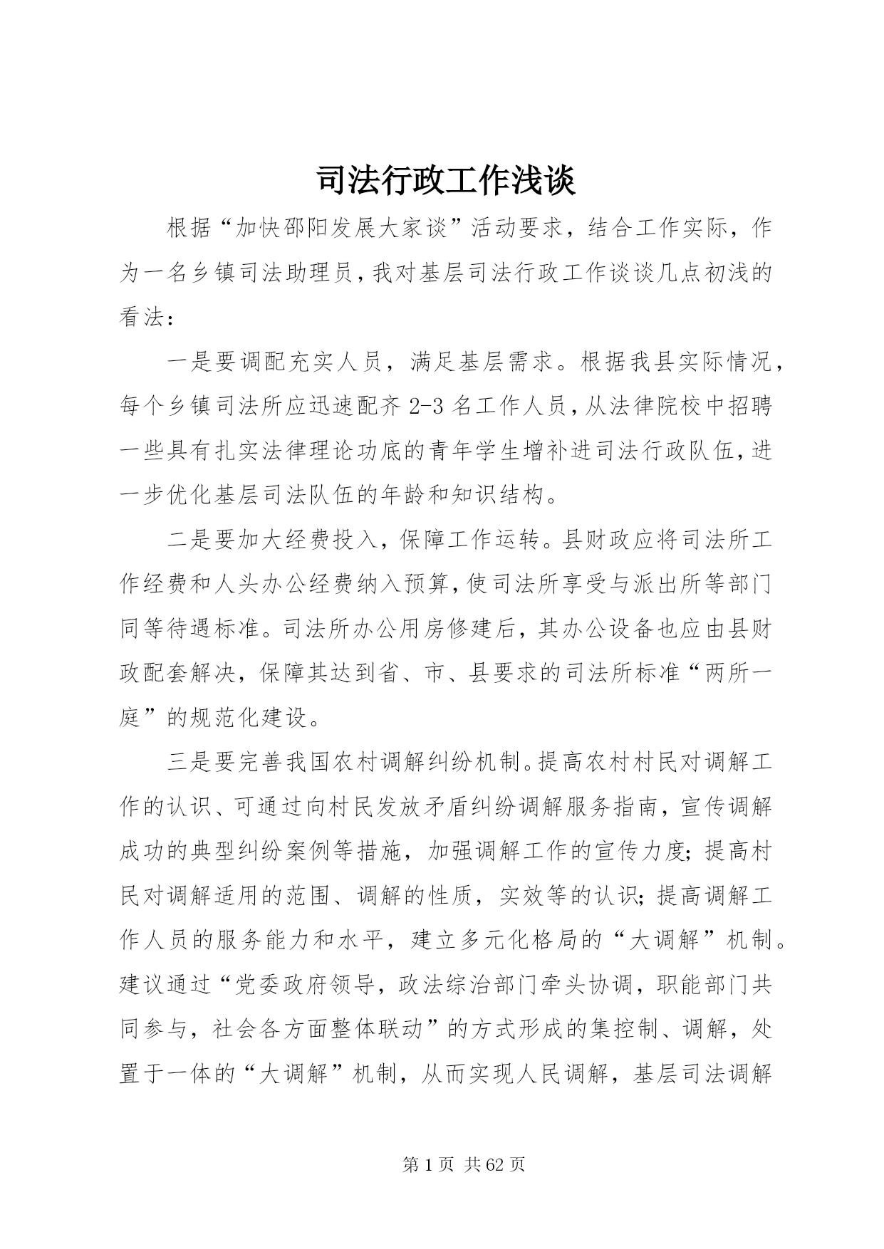 第PAGE\*Arabic\*MERGEFORMAT62页共NUMPAGES\*MERGEFORMAT62页司法行政工作浅谈根据“加快邵阳发展大家谈”活动要求,结合工作实际,作为一名乡镇司法助理员,我对基层司法行政工作谈谈几点初浅的看法:一是要调配充实人员,满足基层需求。根据我县实际情况,每个乡镇司法所应迅速配齐2-3名工作人员,从法律院校中招聘一些具有扎实法律理论功底的青年学生增补进司法行政队伍,进一步优化基层司法队伍的年龄和知识结构。二是要加大经费投入,保障工作运转。县财政应将司法所工作经