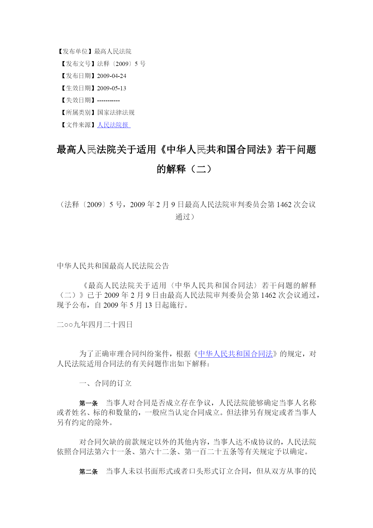 【发布单位】最高人民法院【发布文号】法释〔2009〕5号【发布日期】2009-04-24【生效日期】2009-05-13【失效日期】-----------【所属类别】国家法律法规【文件来源】HYPERLINK"http://rmfyb.chinacourt.org/public/detail.php?id=128300"\t"_blank"人民法院报最高人民法院关于适用《中华人民共和国合同法》若干问题的解释(二)(法释〔2009〕5号,2009年2月9日最高人民法院审判委员会第1462次会议通过)中