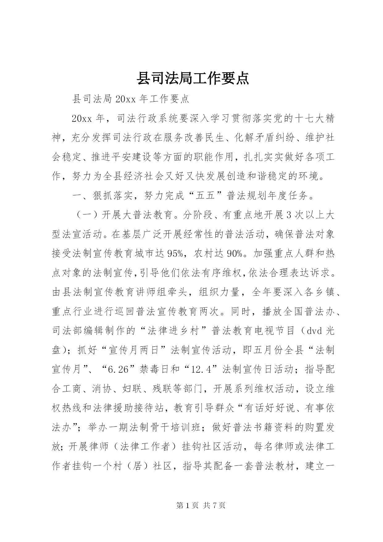 第PAGE\*Arabic\*MERGEFORMAT7页共NUMPAGES\*MERGEFORMAT7页县司法局工作要点县司法局20xx年工作要点20xx年,司法行政系统要深入学习贯彻落实党的十七大精神,充分发挥司法行政在服务改善民生、化解矛盾纠纷、维护社会稳定、推进平安建设等方面的职能作用,扎扎实实做好各项工作,努力为全县经济社会又好又快发展创造和谐稳定的环境。一、狠抓落实,努力完成“五五”普法规划年度任务。(一)开展大普法教育。分阶段、有重点地开展3次以上大型法宣活动。在基层广泛开展经常性