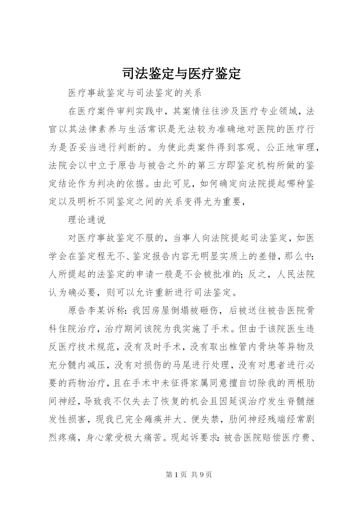 第PAGE\*Arabic\*MERGEFORMAT9页共NUMPAGES\*MERGEFORMAT9页司法鉴定与医疗鉴定医疗事故鉴定与司法鉴定的关系在医疗案件审判实践中,其案情往往涉及医疗专业领域,法官以其法律素养与生活常识是无法较为准确地对医院的医疗行为是否妥当进行判断的。为使此类案件得到客观、公正地审理,法院会以中立于原告与被告之外的第三方即鉴定机构所做的鉴定结论作为判决的依据。由此可见,如何确定向法院提起哪种鉴定以及明析不同鉴定之间的关系变得尤为重要,理论通说对医疗事故鉴定不服的,当事