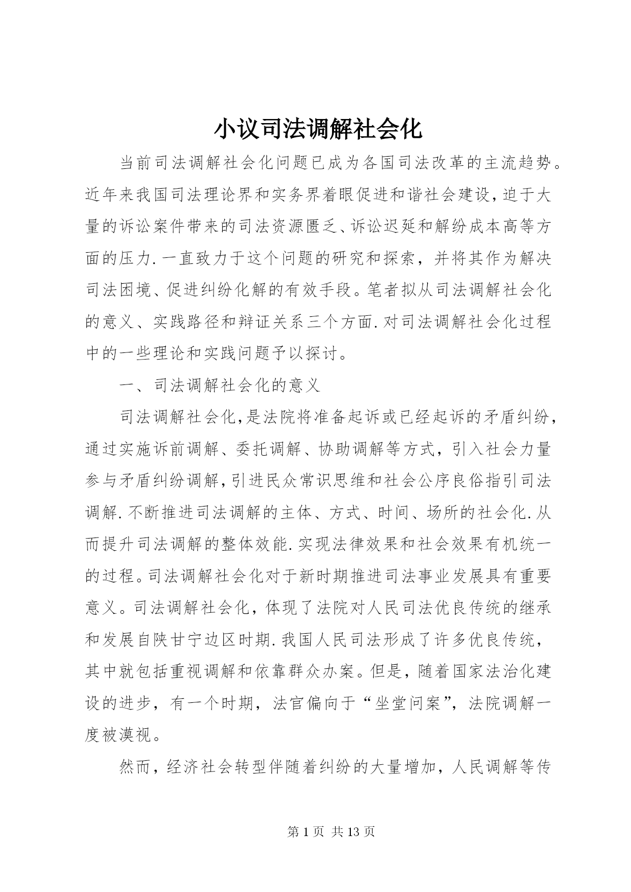 第PAGE\*Arabic\*MERGEFORMAT13页共NUMPAGES\*MERGEFORMAT13页小议司法调解社会化当前司法调解社会化问题已成为各国司法改革的主流趋势。近年来我国司法理论界和实务界着眼促进和谐社会建设,迫于大量的诉讼案件带来的司法资源匮乏、诉讼迟延和解纷成本高等方面的压力.一直致力于这个问题的研究和探索,并将其作为解决司法困境、促进纠纷化解的有效手段。笔者拟从司法调解社会化的意义、实践路径和辩证关系三个方面.对司法调解社会化过程中的一些理论和实践问题予以探讨。一、司法