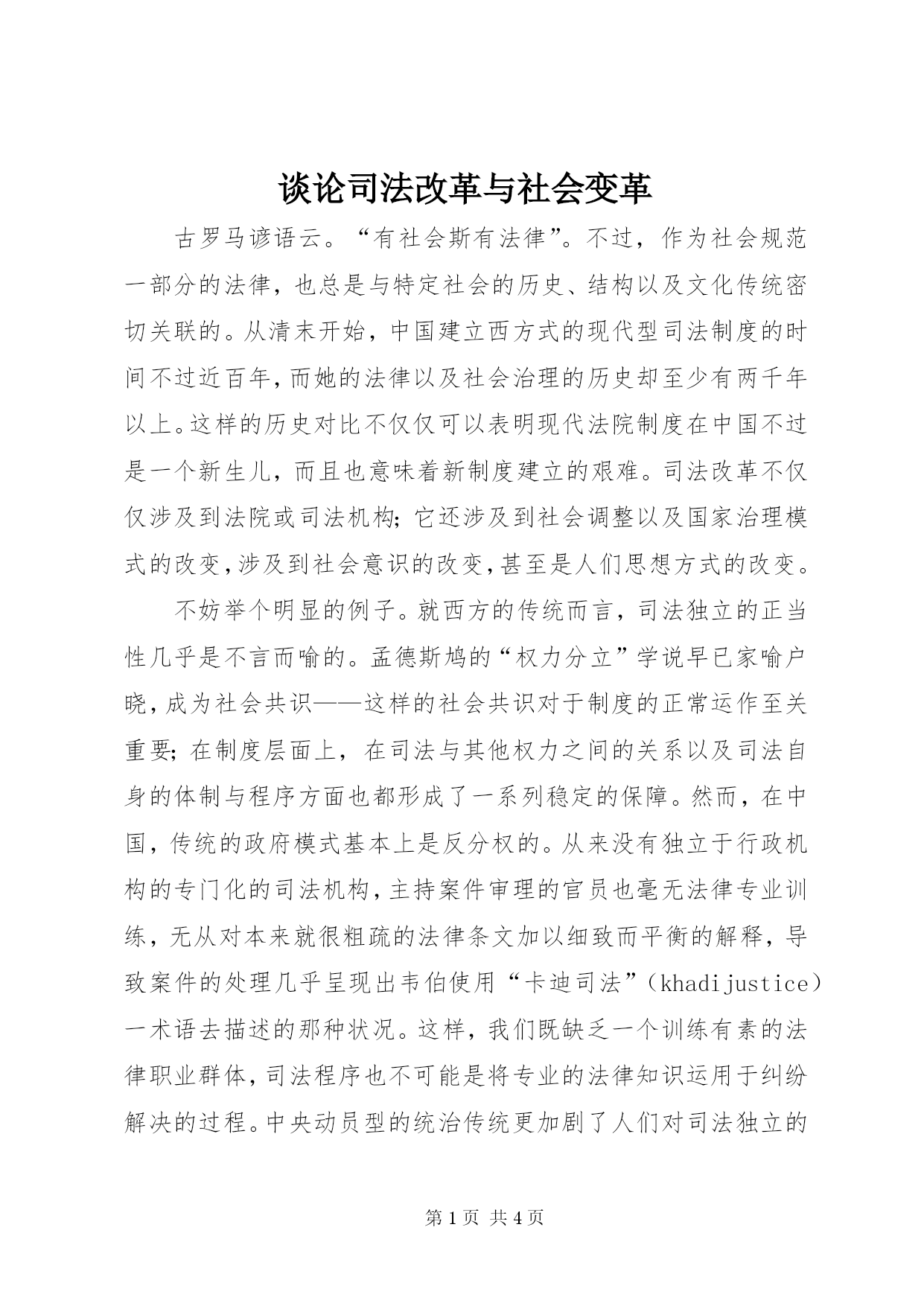 第PAGE\*Arabic\*MERGEFORMAT4页共NUMPAGES\*MERGEFORMAT4页谈论司法改革与社会变革古罗马谚语云。“有社会斯有法律”。不过,作为社会规范一部分的法律,也总是与特定社会的历史、结构以及文化传统密切关联的。从清末开始,中国建立西方式的现代型司法制度的时间不过近百年,而她的法律以及社会治理的历史却至少有两千年以上。这样的历史对比不仅仅可以表明现代法院制度在中国不过是一个新生儿,而且也意味着新制度建立的艰难。司法改革不仅仅涉及到法院或司法机构;它还涉及到社会调