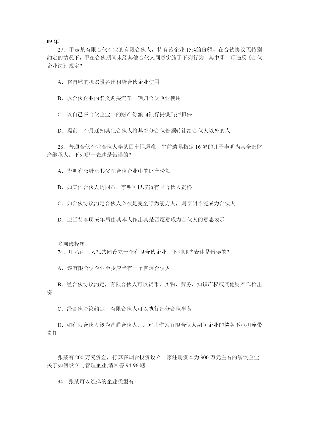 09年27.甲是某有限合伙企业的有限合伙人,持有该企业15%的份额。在合伙协议无特别约定的情况下,甲在合伙期间未经其他合伙人同意实施了下列行为,其中哪一项违反《合伙企业法》规定?A.将自购的机器设备出租给合伙企业使用B.以合伙企业的名义购买汽车一辆归合伙企业使用C.以自己在合伙企业中的财产份额向银行提供质押担保D.提前一个月通知其他合伙人将其部分合伙份额转让给合伙人以外的人28.普通合伙企业合伙人李某因车祸遇难,生前遗嘱指定16岁的儿子李明为其全部财产继承人。下列哪一表述是错误的?A.李明有权继承其父在合