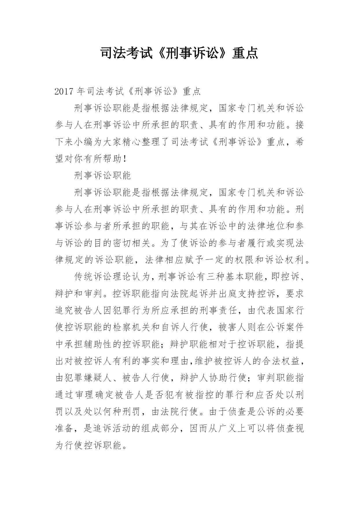 司法考试《刑事诉讼》重点2017年司法考试《刑事诉讼》重点刑事诉讼职能是指根据法律规定,国家专门机关和诉讼参与人在刑事诉讼中所承担的职责、具有的作用和功能。接下来小编为大家精心整理了司法考试《刑事诉讼》重点,希望对你有所帮助!刑事诉讼职能刑事诉讼职能是指根据法律规定,国家专门机关和诉讼参与人在刑事诉讼中所承担的职责、具有的作用和功能。刑事诉讼参与者所承担的职能,与其在诉讼中的法律地位和参与诉讼的目的密切相关。为了使诉讼的参与者履行或实现法律规定的诉讼职能,法律相应赋予一定的权限和诉讼权利。传统诉讼理论认为