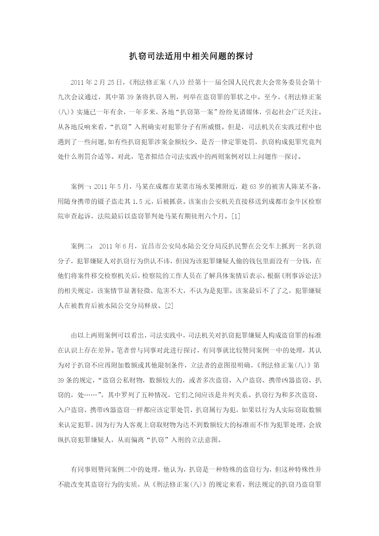 扒窃司法适用中相关问题的探讨2011年2月25日,《刑法修正案(八)》经第十一届全国人民代表大会常务委员会第十九次会议通过,其中第39条将扒窃入刑,列举在盗窃罪的罪状之中。至今,《刑法修正案(八)》实施已一年有余,一年多来,各地“扒窃第一案”纷纷见诸媒体,引起社会广泛关注。从各地反响来看,“扒窃”入刑确实对犯罪分子有所威慑。但是,司法机关在实践过程中也遇到了一些问题,如有些扒窃犯罪涉案金额较少、是否一律定罪处罚,扒窃构成犯罪究竟判处什么刑罚合适等。对此,笔者拟结合司法实践中的两则案例对以上问题作一探讨。案