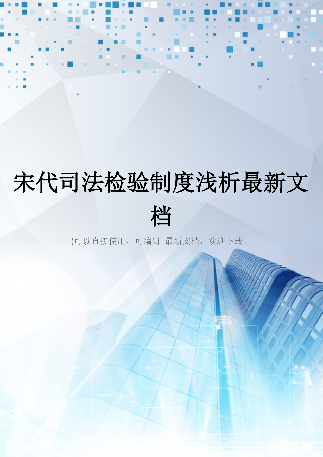宋代司法检验制度浅析最新文档(可以直接使用,可编辑最新文档,欢迎下载)宋代司法检验制度浅析今天的司法鉴定概念是指在诉讼活动中,侦查、检察、审判机关依法委托国家鉴定机构或指聘具备鉴定人资格的专业人员,对案件中的有关专门性问题所作的认定或判断。司法鉴定制度是指与司法鉴定有关的各种法律规定及实际操作规范体系的总和。主要包括司法鉴定决定机关、鉴定的程序、鉴定结论的效力以及鉴定活动在诉讼活动中的地位等内容。我国古代司法鉴定活动历史久远,司法鉴定活动最早出现在西周,秦朝开始运用指纹,东汉时形成简单的法医检验方法,一直