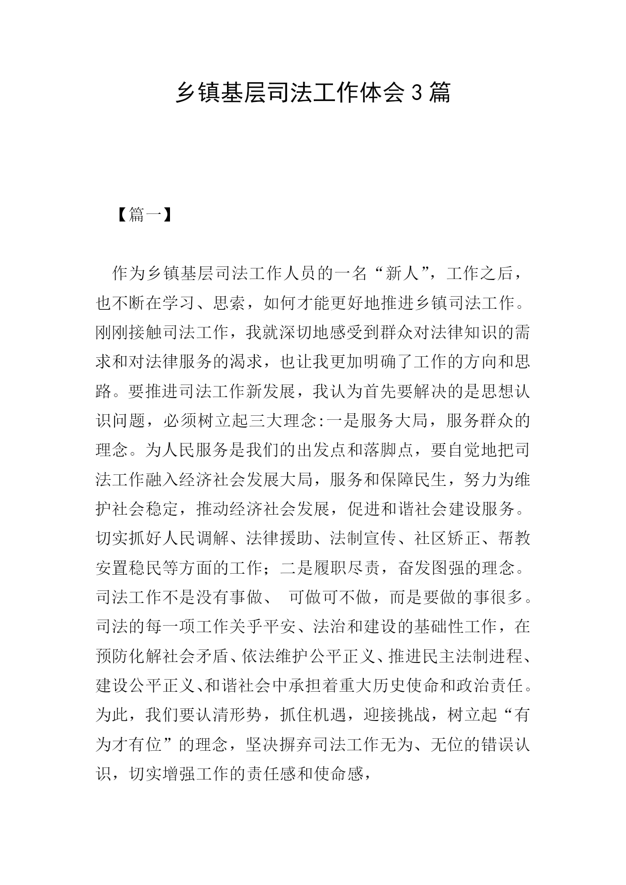 乡镇基层司法工作体会3篇【篇一】作为乡镇基层司法工作人员的一名“新人”,工作之后,也不断在学习、思索,如何才能更好地推进乡镇司法工作。刚刚接触司法工作,我就深切地感受到群众对法律知识的需求和对法律服务的渴求,也让我更加明确了工作的方向和思路。要推进司法工作新发展,我认为首先要解决的是思想认识问题,必须树立起三大理念:一是服务大局,服务群众的理念。为人民服务是我们的出发点和落脚点,要自觉地把司法工作融入经济社会发展大局,服务和保障民生,努力为维护社会稳定,推动经济社会发展,促进和谐社会建设服务。切实抓好人民