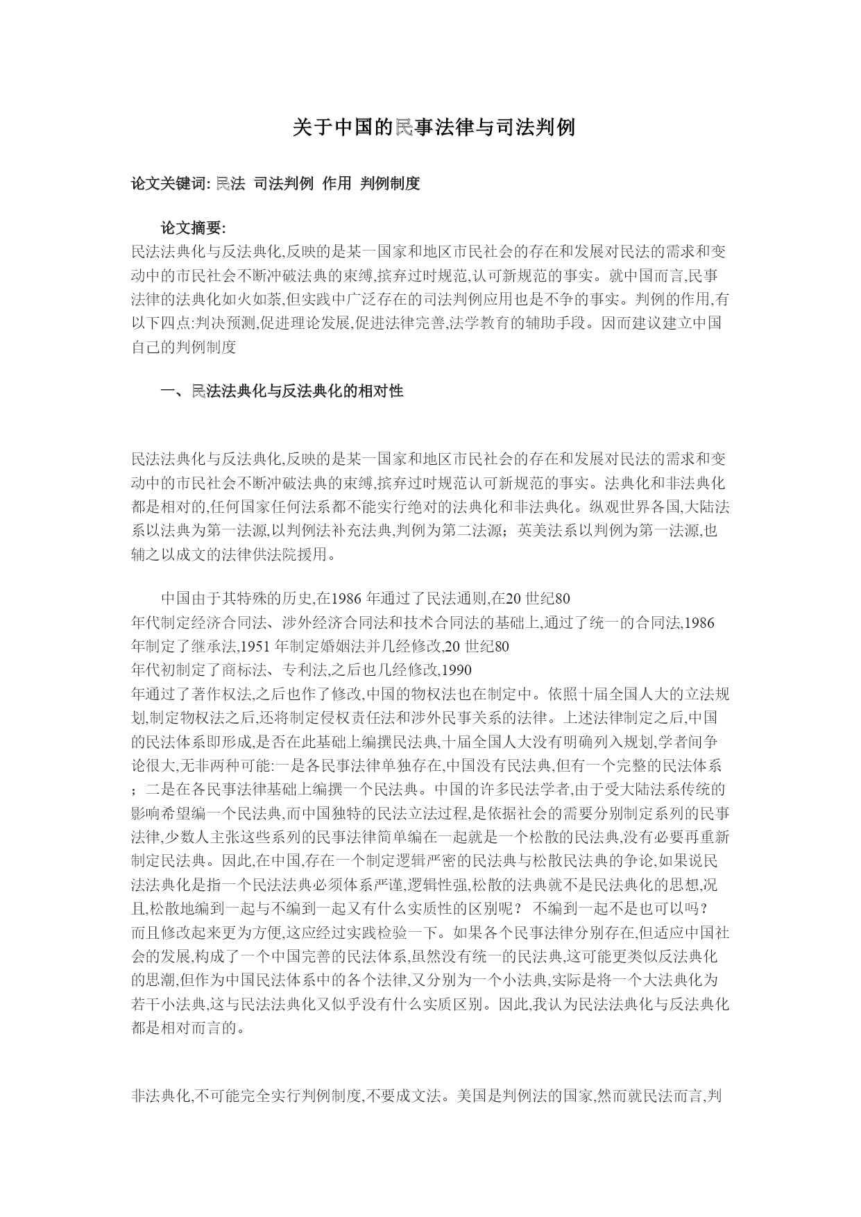 关于中国的民事法律与司法判例论文关键词:HYPERLINK"http://www.lunwentianxia.com/class_free/106_1.shtml"民法司法判例作用判例制度论文摘要:民法法典化与反法典化,反映的是某一国家和地区市民HYPERLINK"http://www.lunwentianxia.com/class_free/15_1.shtml"社会的存在和发展对民法的需求和变动中的市民社会不断冲破法典的束缚,摈弃过时规范,认可新规范的事实。就中国而言,民事HYPERLI