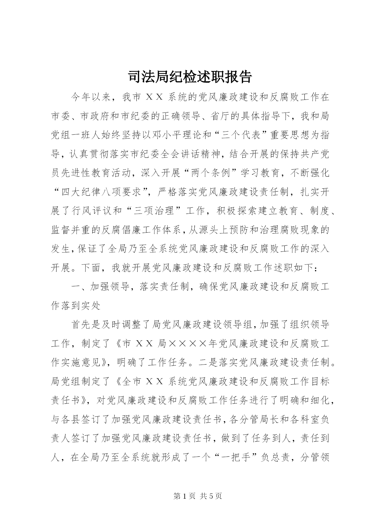 第PAGE\*Arabic\*MERGEFORMAT5页共NUMPAGES\*MERGEFORMAT5页司法局纪检述职报告今年以来,我市ΧΧ系统的党风廉政建设和反腐败工作在市委、市政府和市纪委的正确领导、省厅的具体指导下,我和局党组一班人始终坚持以邓小平理论和“三个代表”重要思想为指导,认真贯彻落实市纪委全会讲话精神,结合开展的保持共产党员先进性教育活动,深入开展“两个条例”学习教育,不断强化“四大纪律八项要求”,严格落实党风廉政建设责任制,扎实开展了行风评议和“三项治理”工作,积极探索建立教