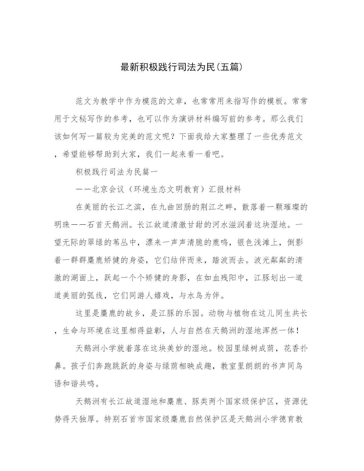 最新积极践行司法为民(五篇)范文为教学中作为模范的文章,也常常用来指写作的模板。常常用于文秘写作的参考,也可以作为演讲材料编写前的参考。那么我们该如何写一篇较为完美的范文呢?下面我给大家整理了一些优秀范文,希望能够帮助到大家,我们一起来看一看吧。积极践行司法为民篇一--北京会议(环境生态文明教育)汇报材料在美丽的长江之滨,在九曲回肠的荆江之畔,散落着一颗璀璨的明珠--石首天鹅洲。长江故道清澈甘甜的河水滋润着这块湿地。一望无际的翠绿的苇丛中,漂来一声声清脆的鹿鸣,银色浅滩上,倒影着一群群麋鹿矫健的身姿,它们