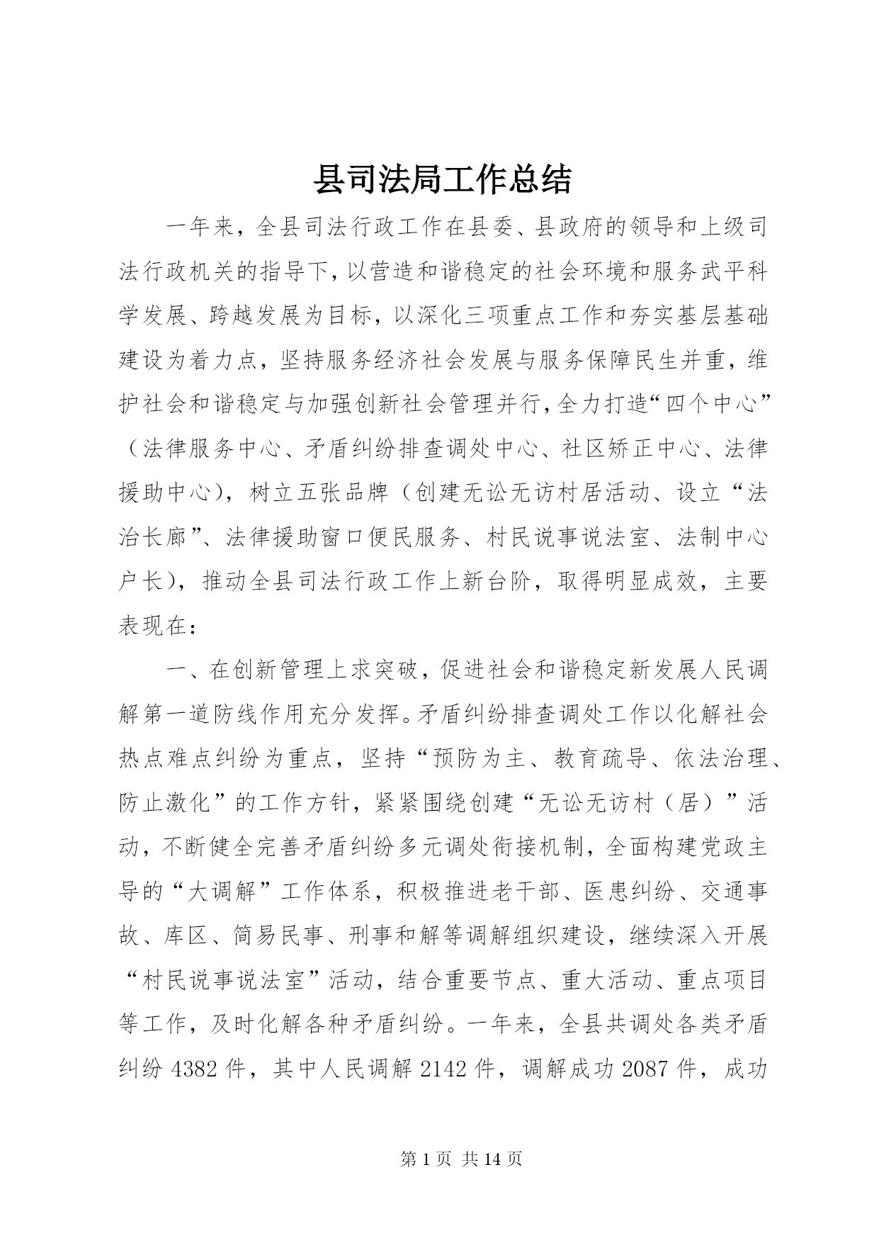 第PAGE\*Arabic\*MERGEFORMAT14页共NUMPAGES\*MERGEFORMAT14页县司法局工作总结一年来,全县司法行政工作在县委、县政府的领导和上级司法行政机关的指导下,以营造和谐稳定的社会环境和服务武平科学发展、跨越发展为目标,以深化三项重点工作和夯实基层基础建设为着力点,坚持服务经济社会发展与服务保障民生并重,维护社会和谐稳定与加强创新社会管理并行,全力打造“四个中心”(法律服务中心、矛盾纠纷排查调处中心、社区矫正中心、法律援助中心),树立五张品牌(创建无讼无访村