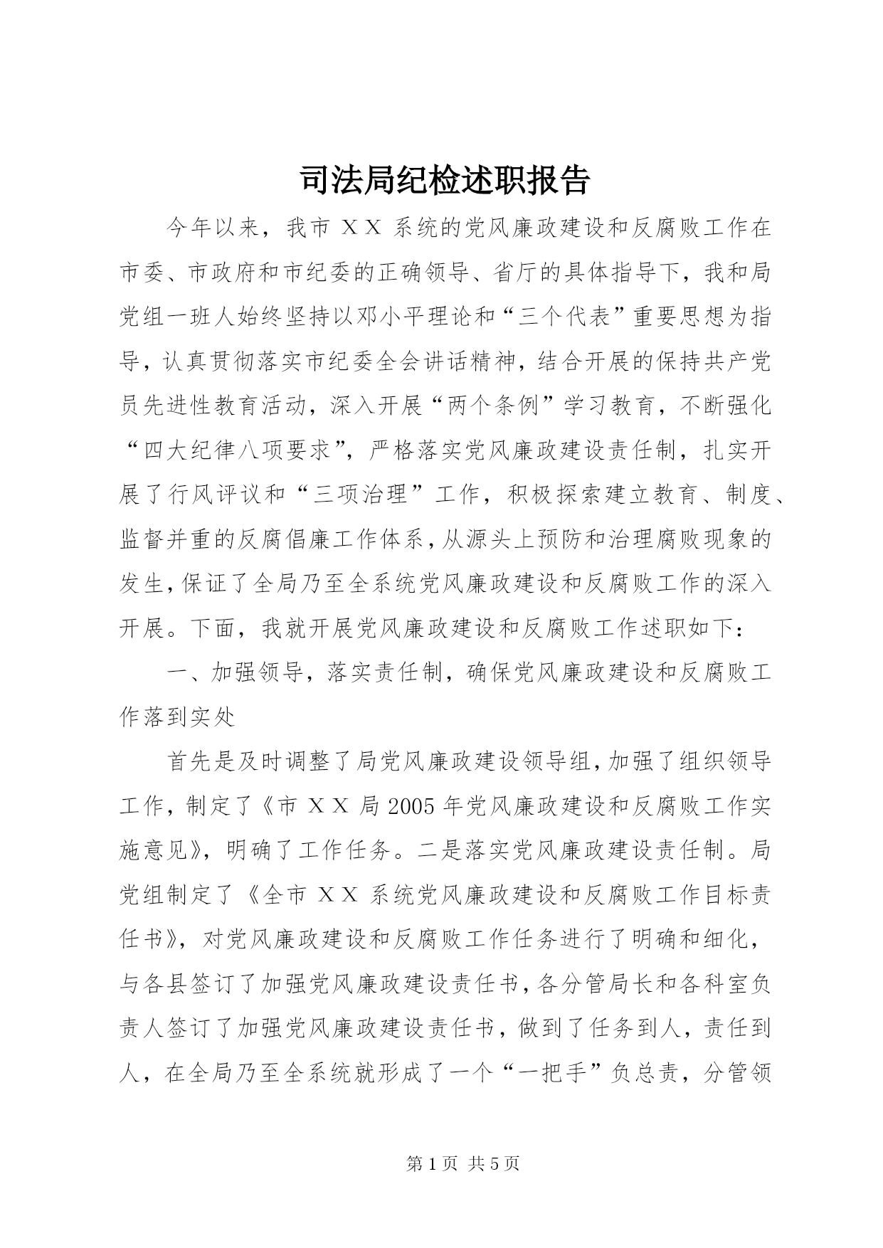 第PAGE\*Arabic\*MERGEFORMAT5页共NUMPAGES\*MERGEFORMAT5页司法局纪检述职报告今年以来,我市ΧΧ系统的党风廉政建设和反腐败工作在市委、市政府和市纪委的正确领导、省厅的具体指导下,我和局党组一班人始终坚持以邓小平理论和“三个代表”重要思想为指导,认真贯彻落实市纪委全会讲话精神,结合开展的保持共产党员先进性教育活动,深入开展“两个条例”学习教育,不断强化“四大纪律八项要求”,严格落实党风廉政建设责任制,扎实开展了行风评议和“三项治理”工作,积极探索建立教