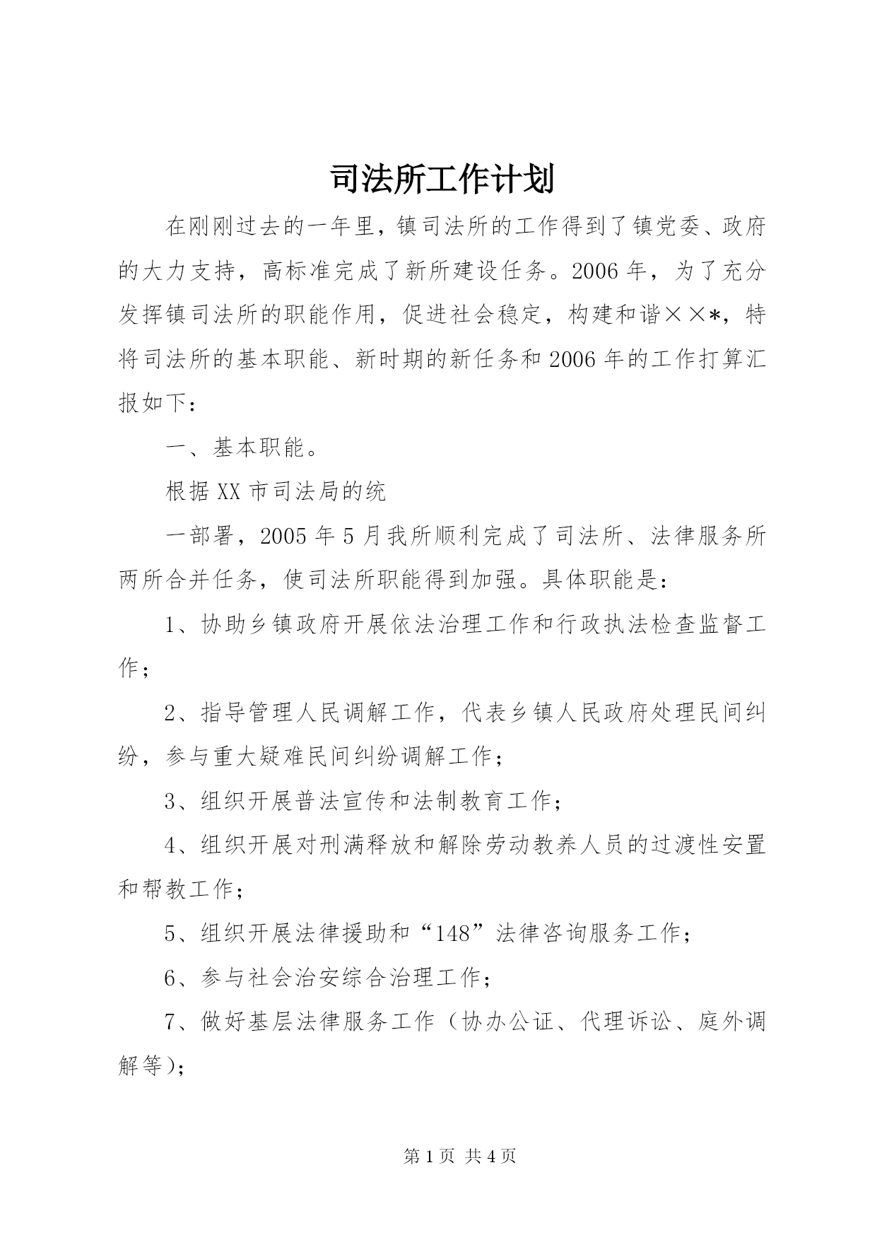 第PAGE\*Arabic\*MERGEFORMAT4页共NUMPAGES\*MERGEFORMAT4页司法所工作计划在刚刚过去的一年里,镇司法所的工作得到了镇党委、政府的大力支持,高标准完成了新所建设任务。2006年,为了充分发挥镇司法所的职能作用,促进社会稳定,构建和谐××*,特将司法所的基本职能、新时期的新任务和2006年的工作打算汇报如下:一、基本职能。根据XX市司法局的统一部署,2005年5月我所顺利完成了司法所、法律服务所两所合并任务,使司法所职能得到加强。具体职能是:1、协助乡镇