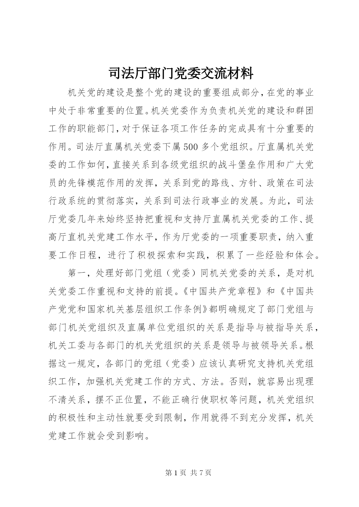 第PAGE\*Arabic\*MERGEFORMAT7页共NUMPAGES\*MERGEFORMAT7页司法厅部门党委交流材料机关党的建设是整个党的建设的重要组成部分,在党的事业中处于非常重要的位置。机关党委作为负责机关党的建设和群团工作的职能部门,对于保证各项工作任务的完成具有十分重要的作用。司法厅直属机关党委下属500多个党组织。厅直属机关党委的工作如何,直接关系到各级党组织的战斗堡垒作用和广大党员的先锋模范作用的发挥,关系到党的路线、方针、政策在司法行政系统的贯彻落实,关系到司法行政事业