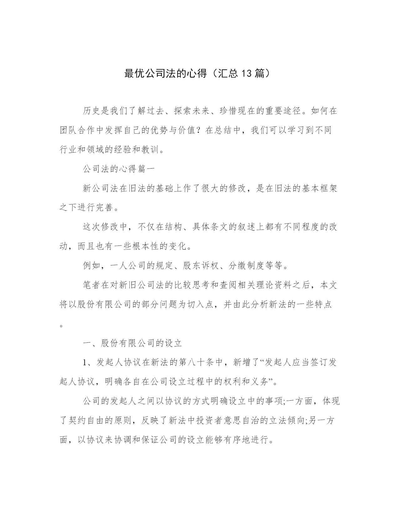 最优公司法的心得(汇总13篇)历史是我们了解过去、探索未来、珍惜现在的重要途径。如何在团队合作中发挥自己的优势与价值?在总结中,我们可以学习到不同行业和领域的经验和教训。公司法的心得篇一新公司法在旧法的基础上作了很大的修改,是在旧法的基本框架之下进行完善。这次修改中,不仅在结构、具体条文的叙述上都有不同程度的改动,而且也有一些根本性的变化。例如,一人公司的规定、股东诉权、分缴制度等等。笔者在对新旧公司法的比较思考和查阅相关理论资料之后,本文将以股份有限公司的部分问题为切入点,并由此分析新法的一些特点。一、