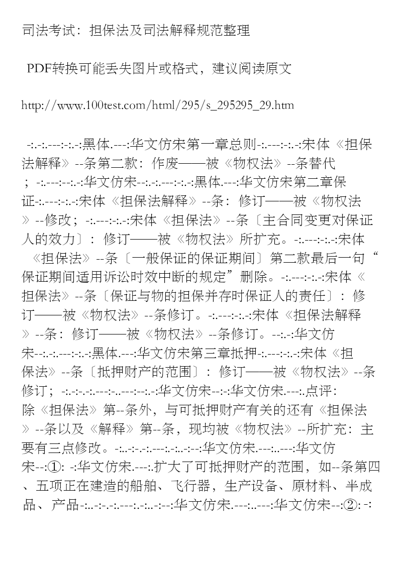 司法考试:担保法及司法解释规范整理PDF转换可能丢失图片或格式,建议阅读原文http://www.100test.com/html/295/s_295295_29.htm-:.-:.---:-:.-:黑体.---:华文仿宋第一章总则-:.---:-:.-:宋体《担保法解释》--条第二款:作废——被《物权法》--条替代;-:.---:--:.-:华文仿宋--:.-:.---:-:.-:黑体.---:华文仿宋第二章保证-:.---:-:.-:宋体《担保法解释》--条:修订——被《物权法》--修改;-:.---