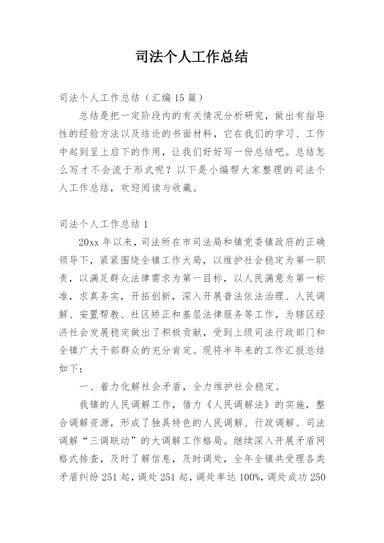 司法个人工作总结司法个人工作总结(汇编15篇)总结是把一定阶段内的有关情况分析研究,做出有指导性的经验方法以及结论的书面材料,它在我们的学习、工作中起到呈上启下的作用,让我们好好写一份总结吧。总结怎么写才不会流于形式呢?以下是小编帮大家整理的司法个人工作总结,欢迎阅读与收藏。司法个人工作总结120xx年以来,司法所在市司法局和镇党委镇政府的正确领导下,紧紧围绕全镇工作大局,以维护社会稳定为第一职责,以满足群众法律需求为第一目标,以人民满意为第一标准,求真务实,开拓创新,深入开展普法依法治理、人民调解、安置