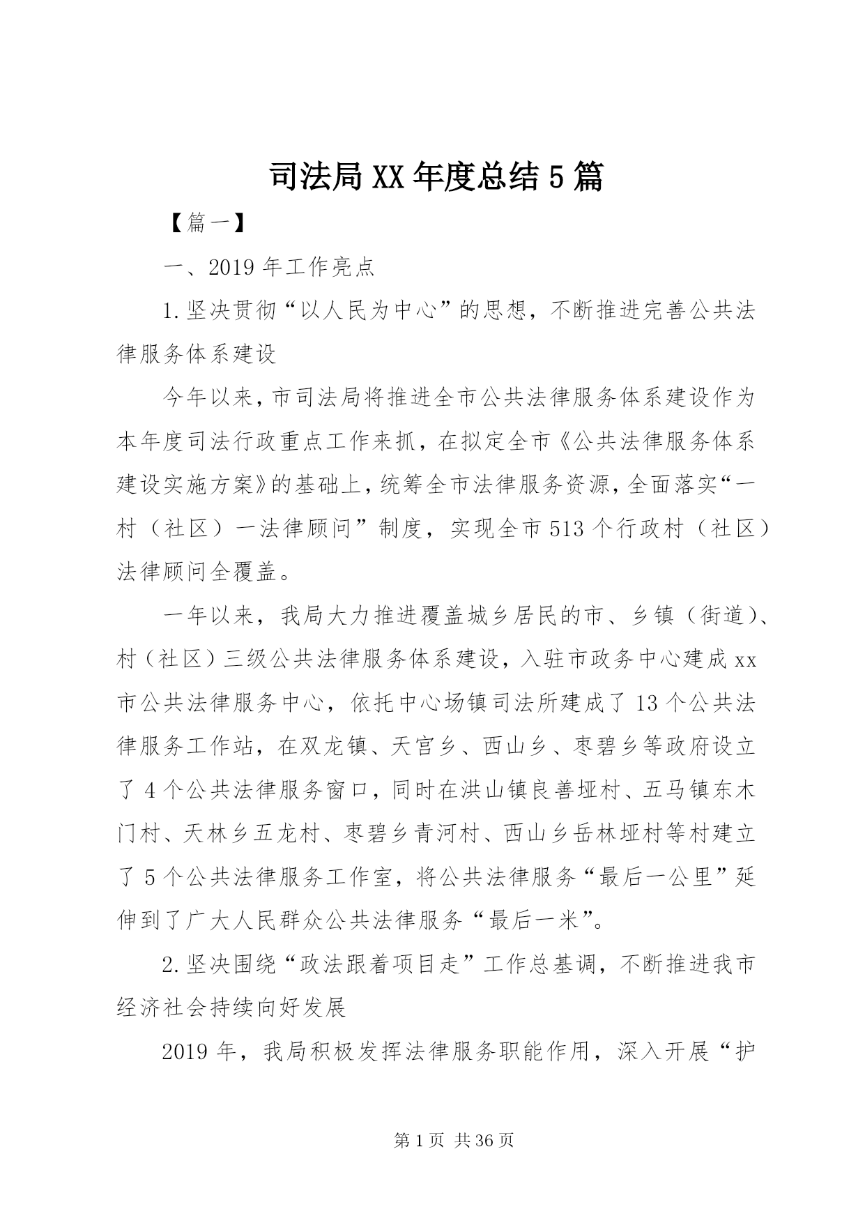 第PAGE\*Arabic\*MERGEFORMAT36页共NUMPAGES\*MERGEFORMAT36页司法局XX年度总结5篇【篇一】一、2019年工作亮点1.坚决贯彻“以人民为中心”的思想,不断推进完善公共法律服务体系建设今年以来,市司法局将推进全市公共法律服务体系建设作为本年度司法行政重点工作来抓,在拟定全市《公共法律服务体系建设实施方案》的基础上,统筹全市法律服务资源,全面落实“一村(社区)一法律顾问”制度,实现全市513个行政村(社区)法律顾问全覆盖。一年以来,我局大力推进覆盖城乡