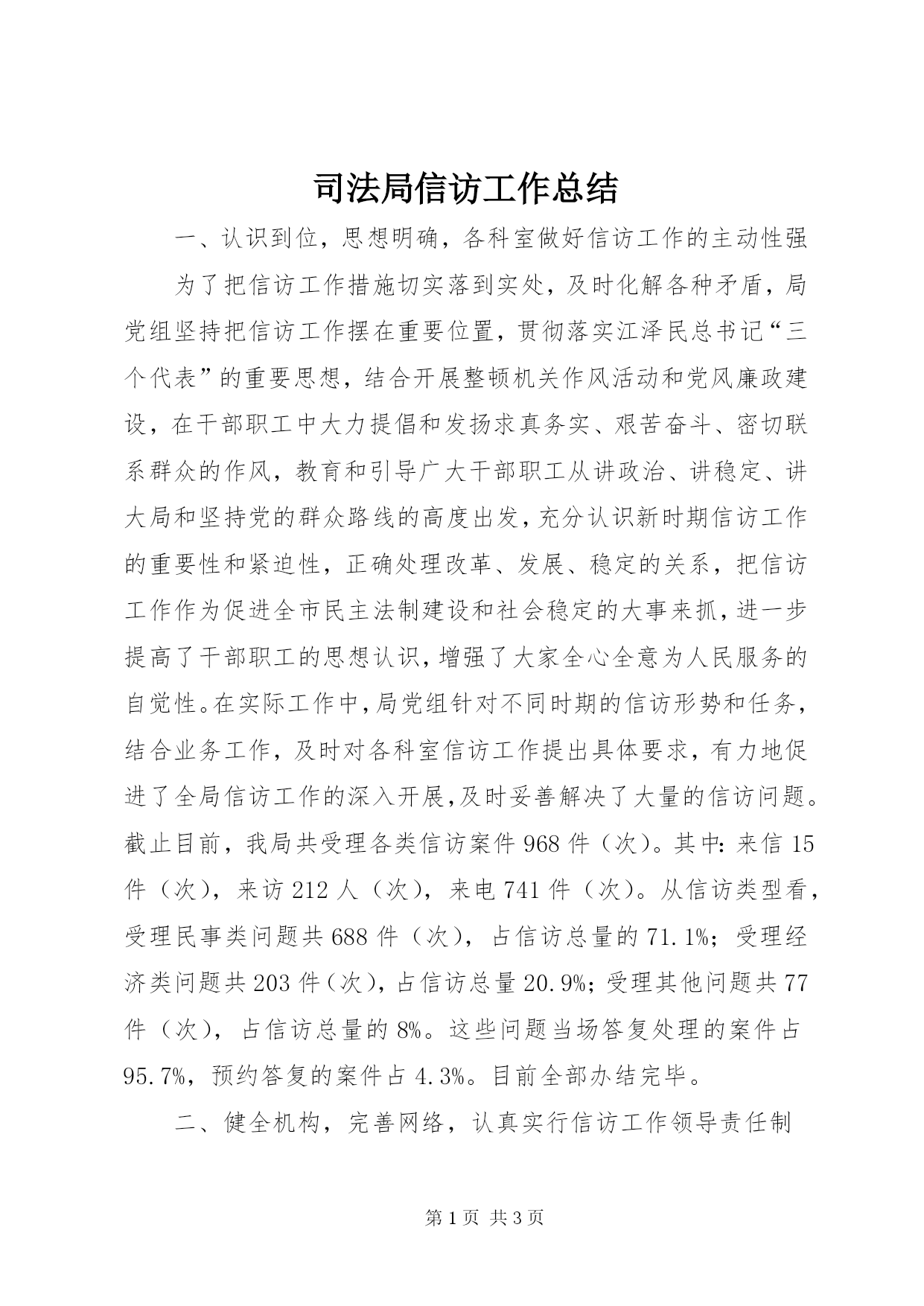 第PAGE\*Arabic\*MERGEFORMAT3页共NUMPAGES\*MERGEFORMAT3页司法局信访工作总结一、认识到位,思想明确,各科室做好信访工作的主动性强为了把信访工作措施切实落到实处,及时化解各种矛盾,局党组坚持把信访工作摆在重要位置,贯彻落实江泽民总书记“三个代表”的重要思想,结合开展整顿机关作风活动和党风廉政建设,在干部职工中大力提倡和发扬求真务实、艰苦奋斗、密切联系群众的作风,教育和引导广大干部职工从讲政治、讲稳定、讲大局和坚持党的群众路线的高度出发,充分认识新时期