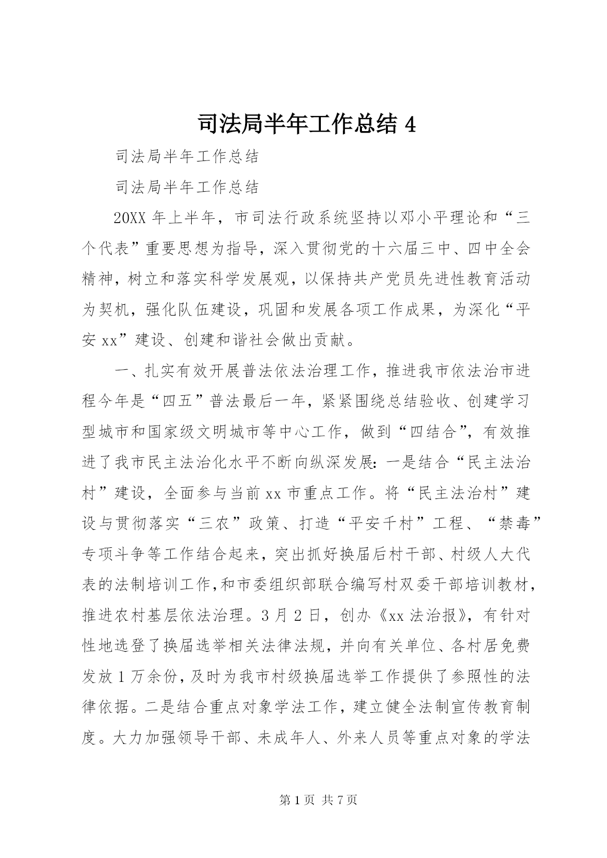第PAGE\*Arabic\*MERGEFORMAT7页共NUMPAGES\*MERGEFORMAT7页司法局半年工作总结4司法局半年工作总结司法局半年工作总结20XX年上半年,市司法行政系统坚持以邓小平理论和“三个代表”重要思想为指导,深入贯彻党的十六届三中、四中全会精神,树立和落实科学发展观,以保持共产党员先进性教育活动为契机,强化队伍建设,巩固和发展各项工作成果,为深化“平安xx”建设、创建和谐社会做出贡献。一、扎实有效开展普法依法治理工作,推进我市依法治市进程今年是“四五”普法最后一年