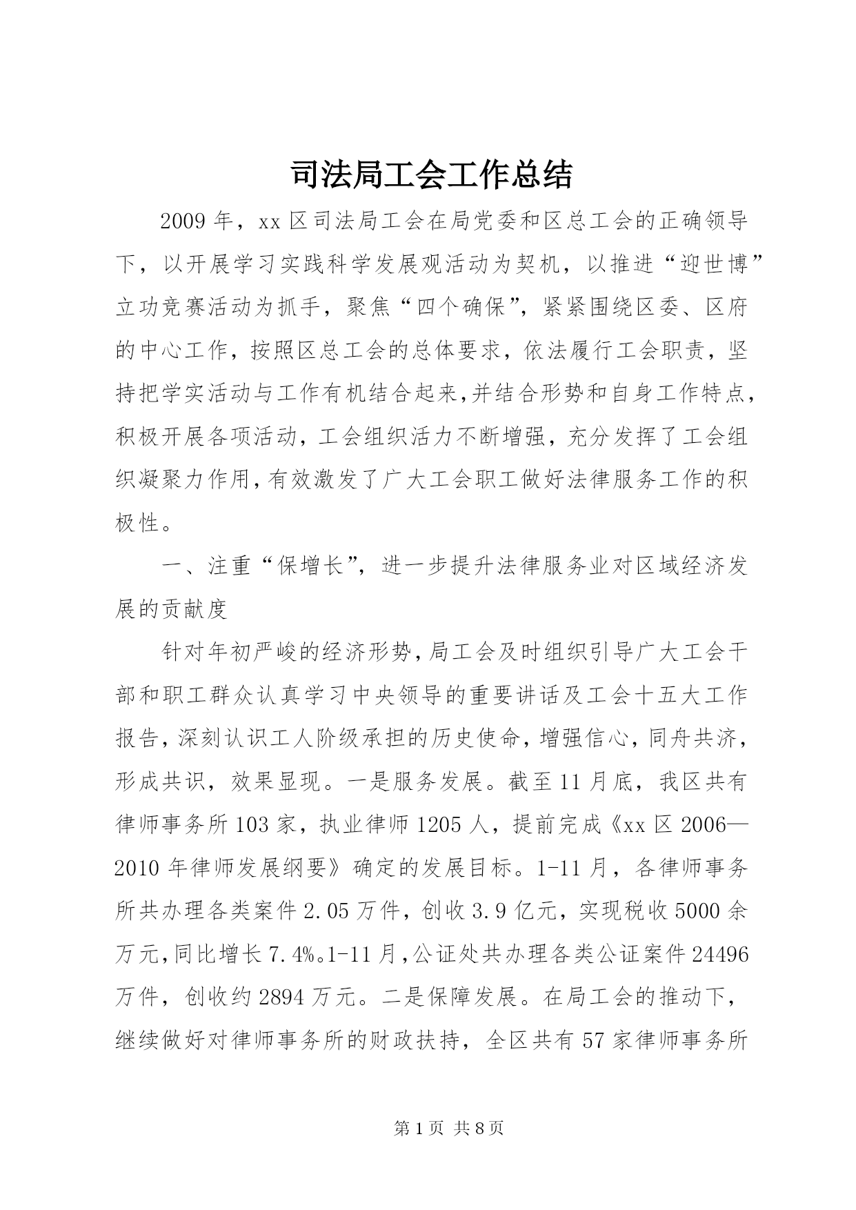 第PAGE\*Arabic\*MERGEFORMAT8页共NUMPAGES\*MERGEFORMAT8页司法局工会工作总结2009年,xx区司法局工会在局党委和区总工会的正确领导下,以开展学习实践科学发展观活动为契机,以推进“迎世博”立功竞赛活动为抓手,聚焦“四个确保”,紧紧围绕区委、区府的中心工作,按照区总工会的总体要求,依法履行工会职责,坚持把学实活动与工作有机结合起来,并结合形势和自身工作特点,积极开展各项活动,工会组织活力不断增强,充分发挥了工会组织凝聚力作用,有效激发了广大工会职工做