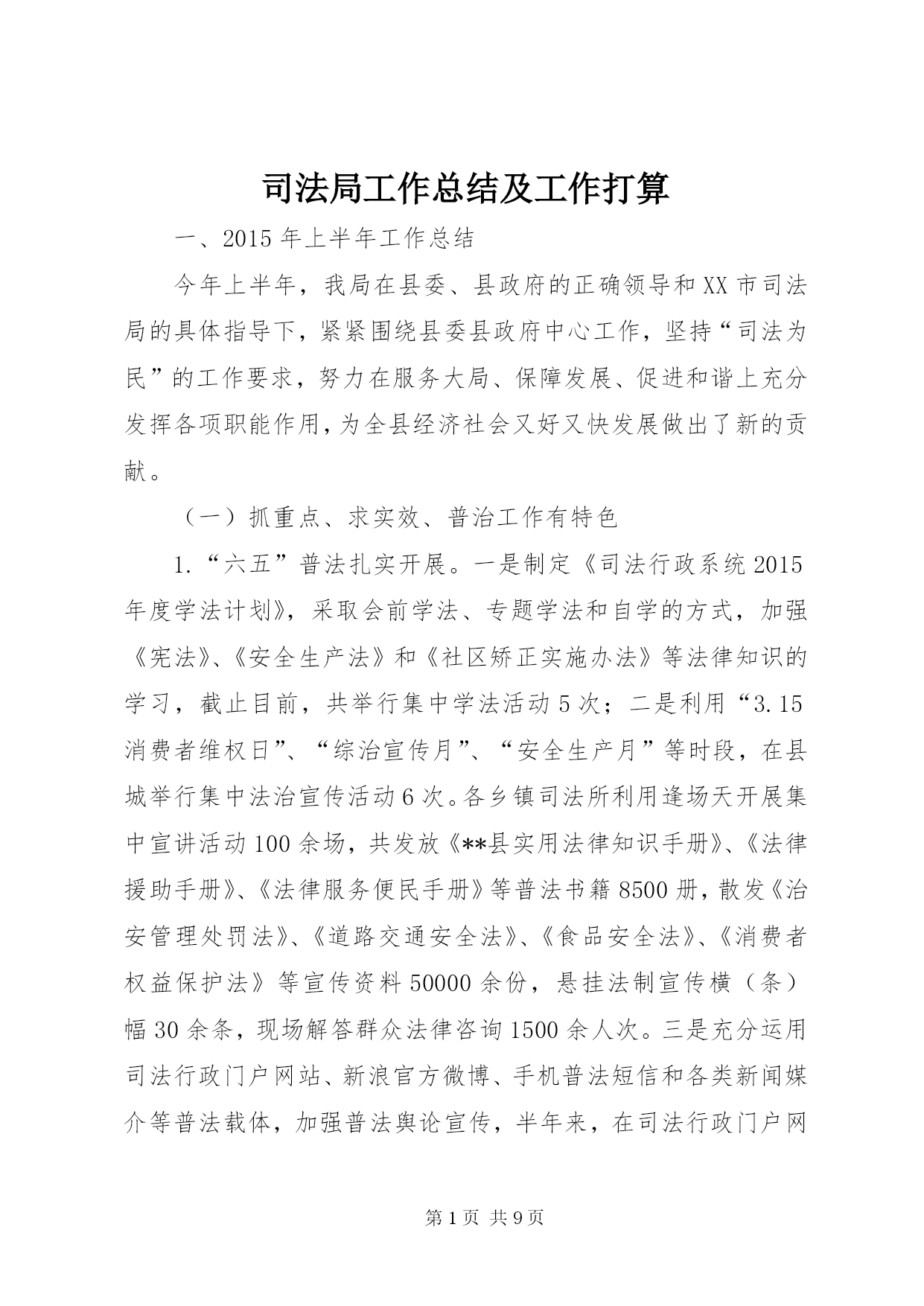 第PAGE\*Arabic\*MERGEFORMAT9页共NUMPAGES\*MERGEFORMAT9页司法局工作总结及工作打算一、2015年上半年工作总结今年上半年,我局在县委、县政府的正确领导和XX市司法局的具体指导下,紧紧围绕县委县政府中心工作,坚持“司法为民”的工作要求,努力在服务大局、保障发展、促进和谐上充分发挥各项职能作用,为全县经济社会又好又快发展做出了新的贡献。(一)抓重点、求实效、普治工作有特色1.“六五”普法扎实开展。一是制定《司法行政系统2015年度学法计划》,采取会前学