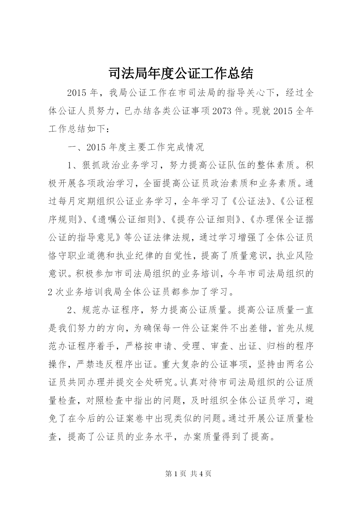 第PAGE\*Arabic\*MERGEFORMAT4页共NUMPAGES\*MERGEFORMAT4页司法局年度公证工作总结2015年,我局公证工作在市司法局的指导关心下,经过全体公证人员努力,已办结各类公证事项2073件。现就2015全年工作总结如下:一、2015年度主要工作完成情况1、狠抓政治业务学习,努力提高公证队伍的整体素质。积极开展各项政治学习,全面提高公证员政治素质和业务素质。通过每月定期组织公证业务学习,全年学习了《公证法》、《公证程序规则》、《遗嘱公证细则》、《提存公证细则》