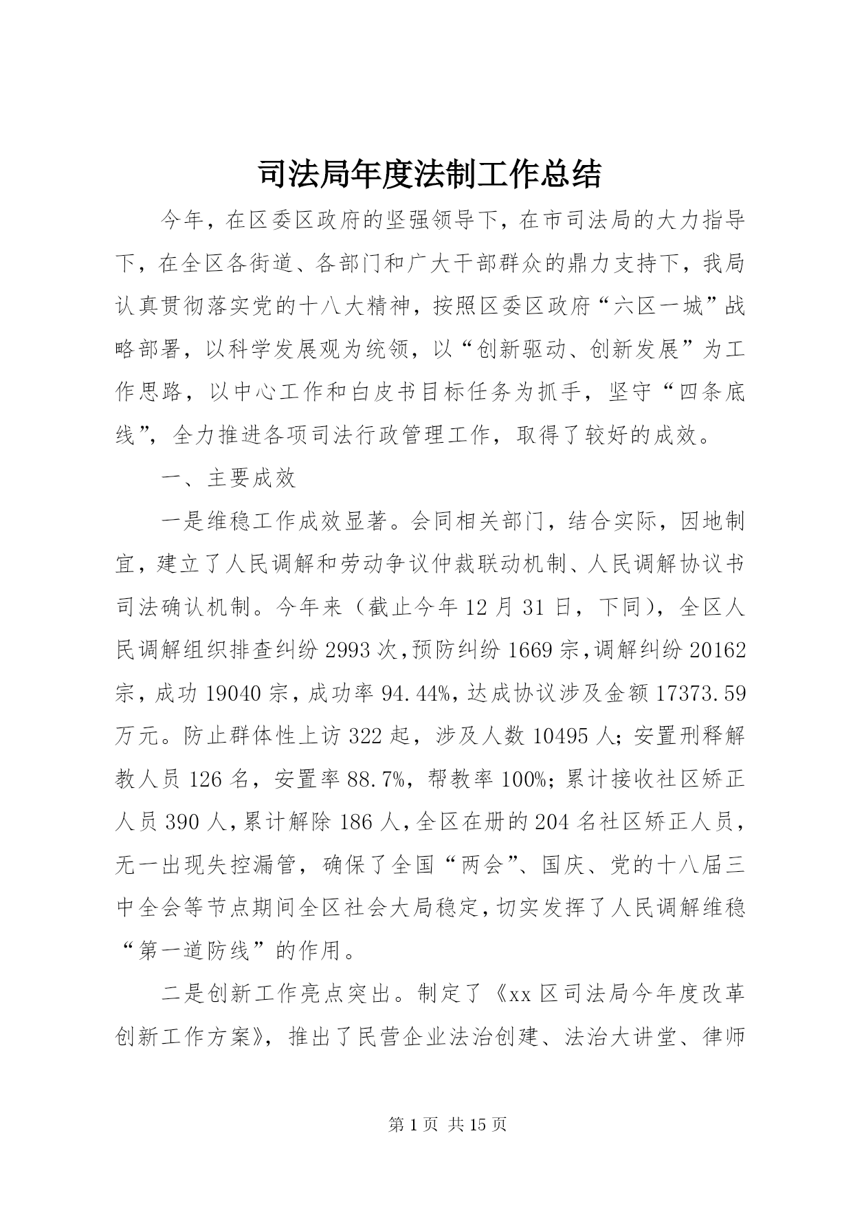 第PAGE\*Arabic\*MERGEFORMAT15页共NUMPAGES\*MERGEFORMAT15页司法局年度法制工作总结今年,在区委区政府的坚强领导下,在市司法局的大力指导下,在全区各街道、各部门和广大干部群众的鼎力支持下,我局认真贯彻落实党的十八大精神,按照区委区政府“六区一城”战略部署,以科学发展观为统领,以“创新驱动、创新发展”为工作思路,以中心工作和白皮书目标任务为抓手,坚守“四条底线”,全力推进各项司法行政管理工作,取得了较好的成效。一、主要成效一是维稳工作成效显著。会同相