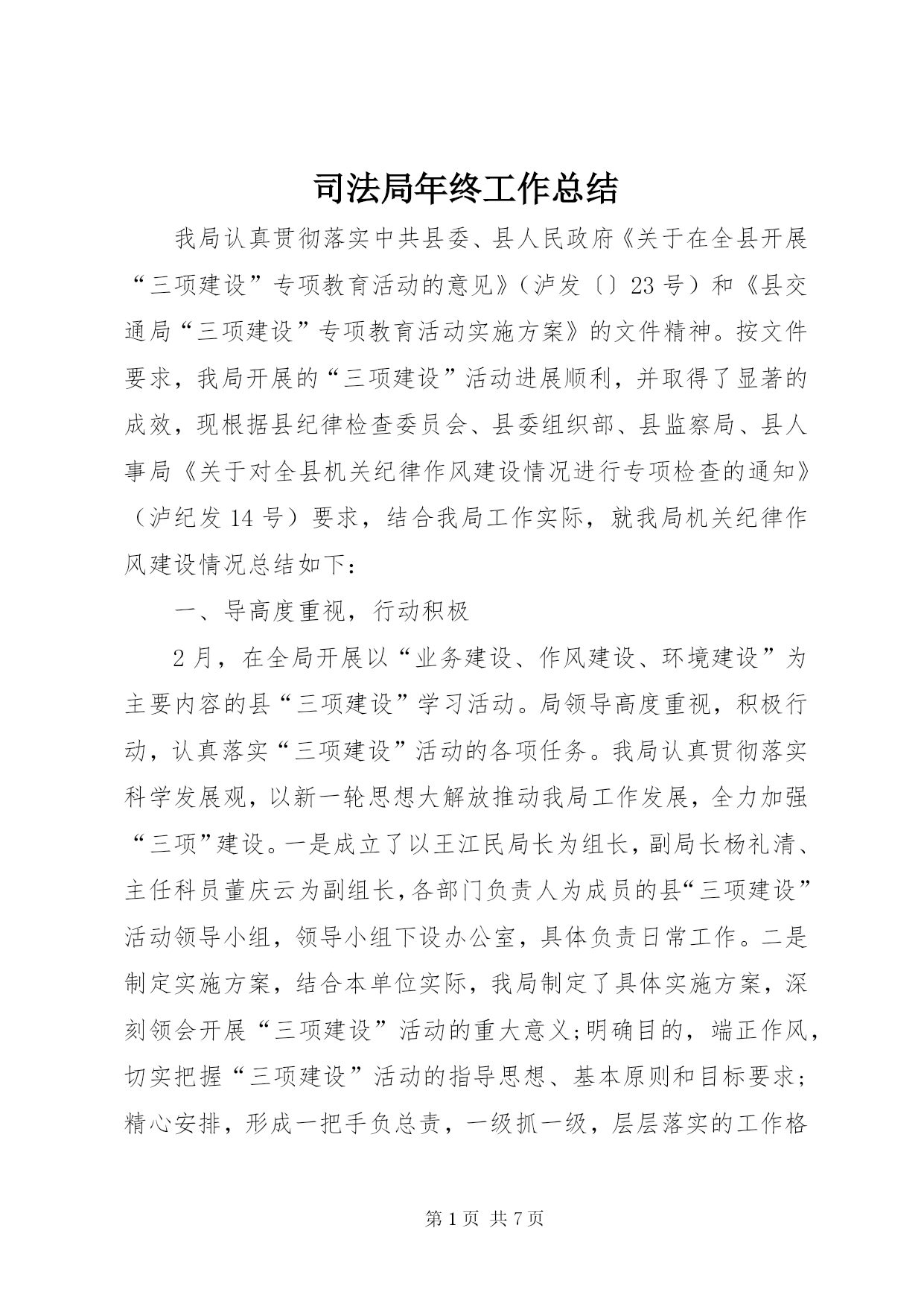 第PAGE\*Arabic\*MERGEFORMAT7页共NUMPAGES\*MERGEFORMAT7页司法局年终工作总结我局认真贯彻落实中共县委、县人民政府《关于在全县开展“三项建设”专项教育活动的意见》(泸发〔〕23号)和《县交通局“三项建设”专项教育活动实施方案》的文件精神。按文件要求,我局开展的“三项建设”活动进展顺利,并取得了显著的成效,现根据县纪律检查委员会、县委组织部、县监察局、县人事局《关于对全县机关纪律作风建设情况进行专项检查的通知》(泸纪发14号)要求,结合我局工作实际,就