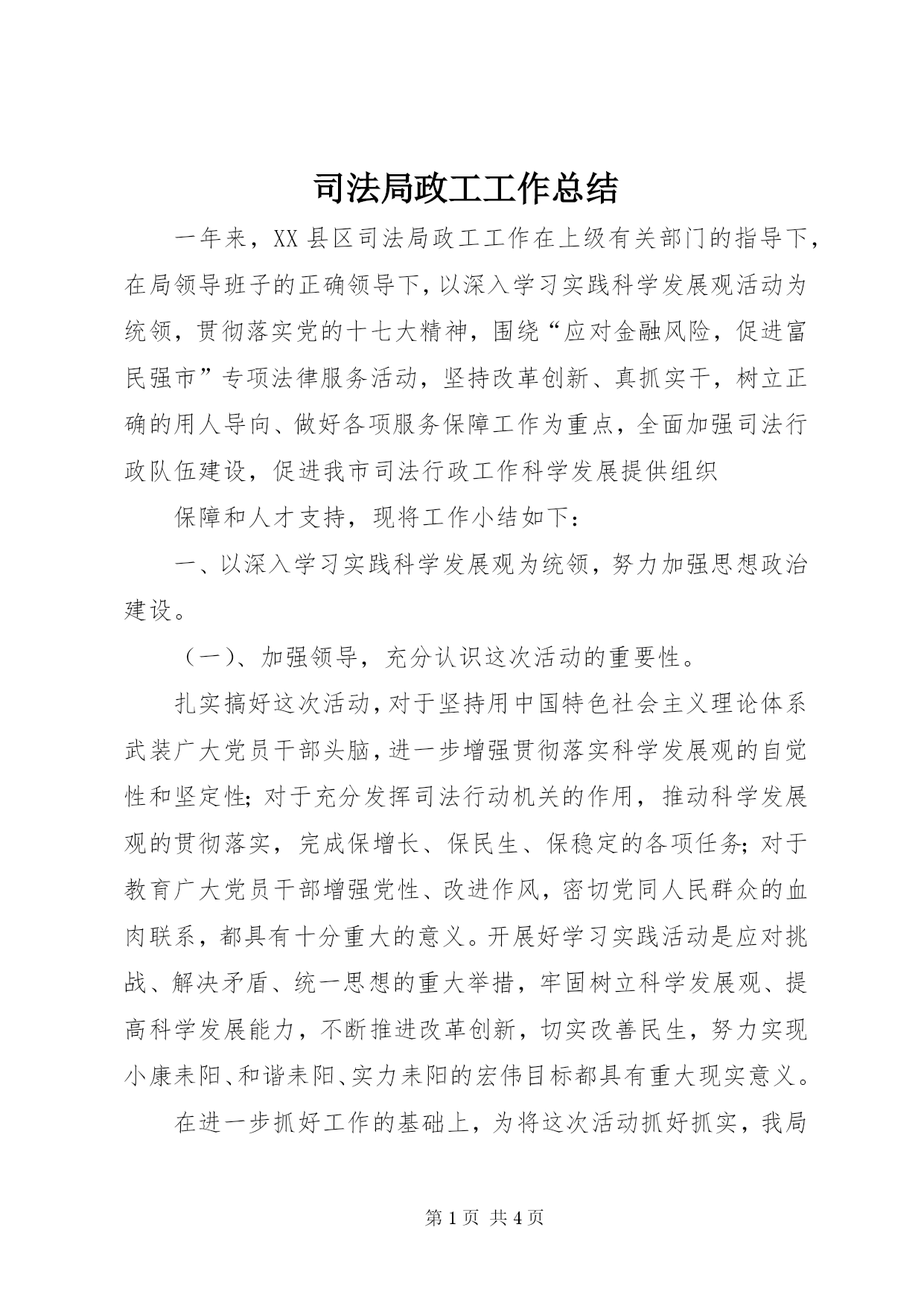第PAGE\*Arabic\*MERGEFORMAT4页共NUMPAGES\*MERGEFORMAT4页司法局政工工作总结一年来,XX县区司法局政工工作在上级有关部门的指导下,在局领导班子的正确领导下,以深入学习实践科学发展观活动为统领,贯彻落实党的十七大精神,围绕“应对金融风险,促进富民强市”专项法律服务活动,坚持改革创新、真抓实干,树立正确的用人导向、做好各项服务保障工作为重点,全面加强司法行政队伍建设,促进我市司法行政工作科学发展提供组织保障和人才支持,现将工作小结如下:一、以深入学习实